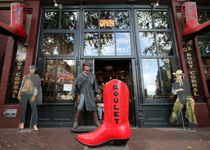 The O.K. Boot Corral is like a western movie come to life. If you can find Gassy Jack, you have located the Corral on Carrall. Clint Eastwood, John Wayne and some random mean looking grifter stand outside, ready to silently greet (glare) at customers. The shop is one of the best in Vancouver to find quality crafted leather goods, snap button western shirts and cowboy hats.