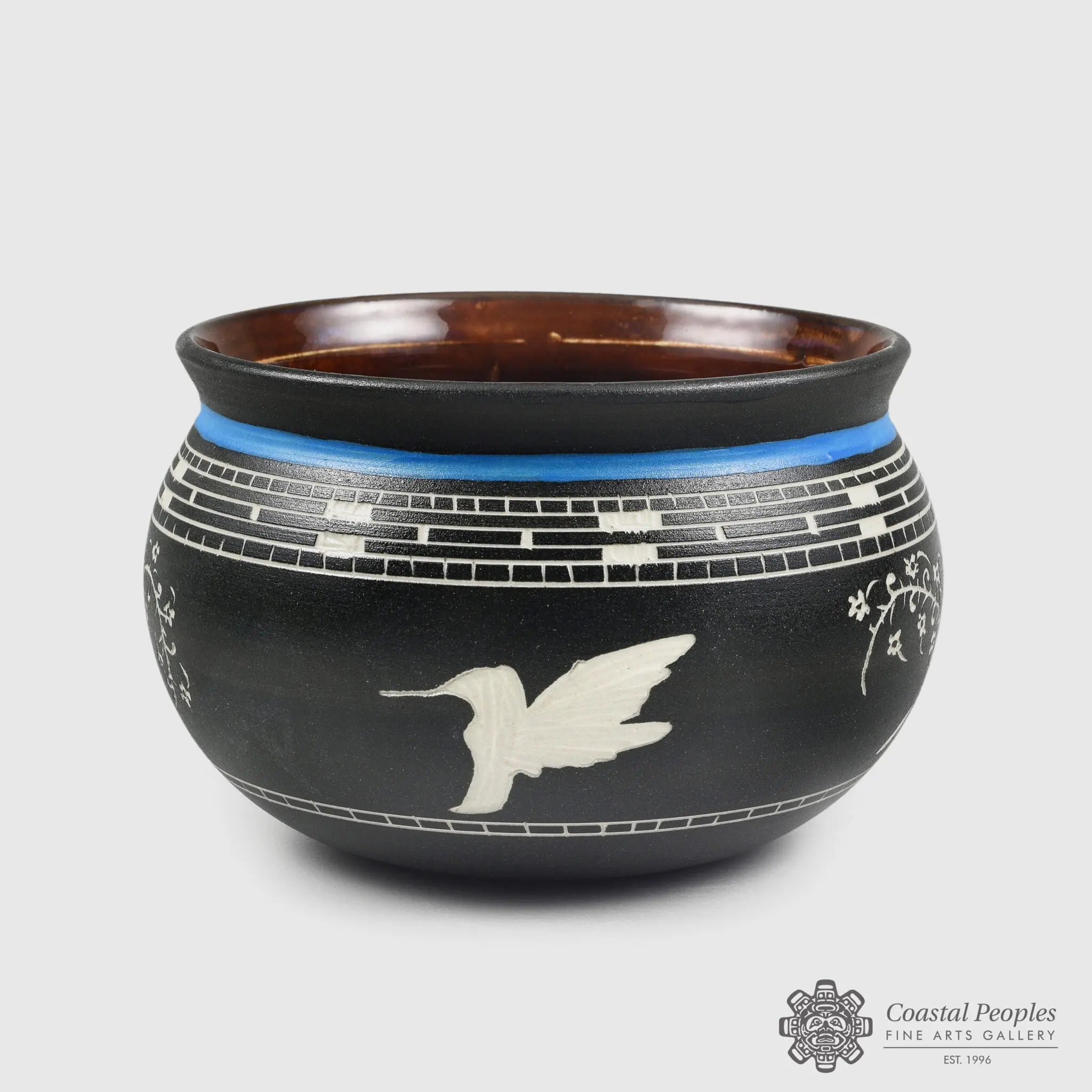 This holiday season, Coastal Peoples Fine Arts Gallery is celebrating artists such as Robert Davidson (Haida), who is currently the subject of an exhibition entitled Guud san glans Robert Davidson: A Line That Bends But Does Not Break (running until April 16, 2023) at the Vancouver Art Gallery. Jewelry by Corrine Hunt (Kwakwaka’wakw/Tlingit), David Neel (Kwakwaka’wakw), and Lyle Wilson (Haisla) is always popular as gifts. And finally, Washbern suggests accessories, such as a raven card holder, by Dorothy Grant (Haida), or pottery, such as a basket weave bowl, by artist Patrick Leach (Interior Salish).