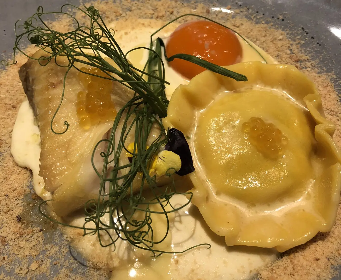 Saffron Poached Sablefish/Chili Crab Ravioli/Smoked Oyster Cream/Golden Char Caviar/Bottarga ‘Sand’/Cured Golden Yolk/Saffron Lemon Butter Sauce
