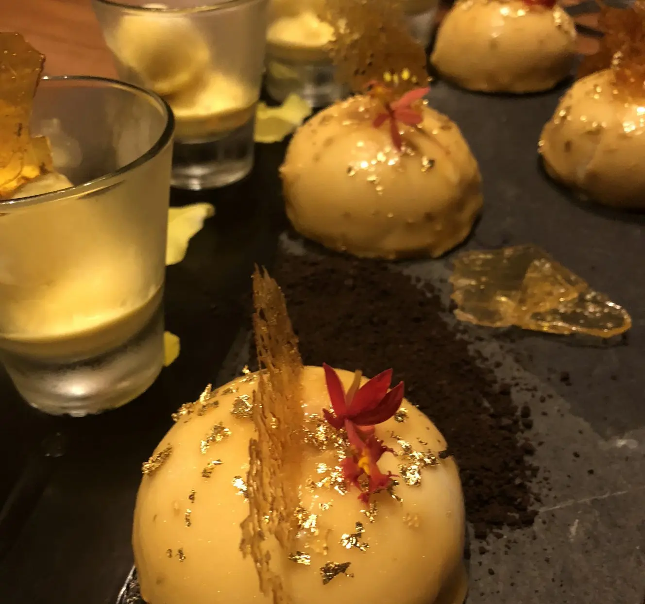Caramelized White Chocolate Mousse/Passion Fruit Gelee/Hazelnut Sesame Wafer/Mango Crystallized Ginger Ice Cream