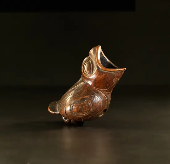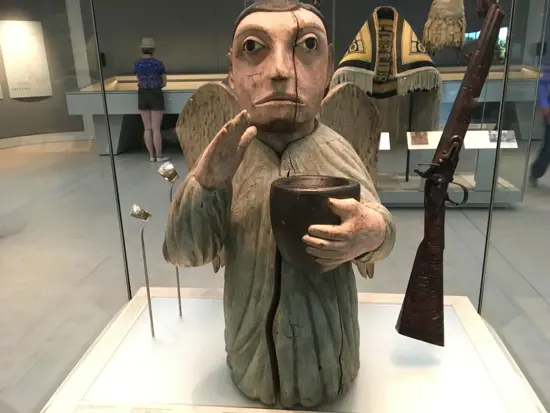 The exhibition also examines the resilience and creativity of Northwest Coast artists in the face of colonization, attempted assimilation, and conflict. An 1886 carved wooden angel from a baptismal font, attributed to Frederick Alexcee, Tsimshian (Lax Kw’alaams), for instance, evidences this meeting of nations and cultures.