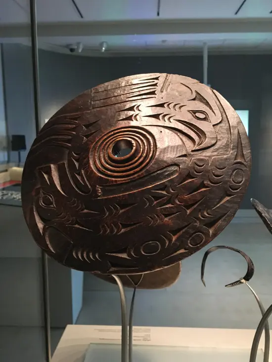 A particularly “revealing” work are mid-1800s cedar planks from a painted façade collected in Lax Kw’alaams, a northern coast village of BC. Traditionally, these paintings depicted family crests and animal/spiritual figures in order to display wealth and status. At first glance, the planks look ordinary, but visitors can activate light that reveals some of the original design. The result is breathtaking.