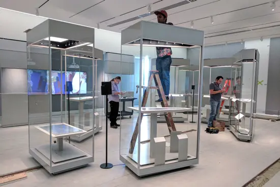 In addition, the exhibition contains multimedia elements, such as film projections and high-tech Idea Chairs, where visitors can listen to the stories of Clyde Tallio (a Nuxalk knowledge keeper, ceremonialist and speaker), Molly Billows (a Homalco Nation spoken-word poet), Rena Point Bolton (a Stó:lō matriarch and artist), and Sharon Fortney (a Coast Salish curator).
