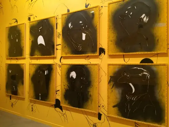 The project revisited for this exhibition showcases large stenciled heads meant to parody bosses and workers.