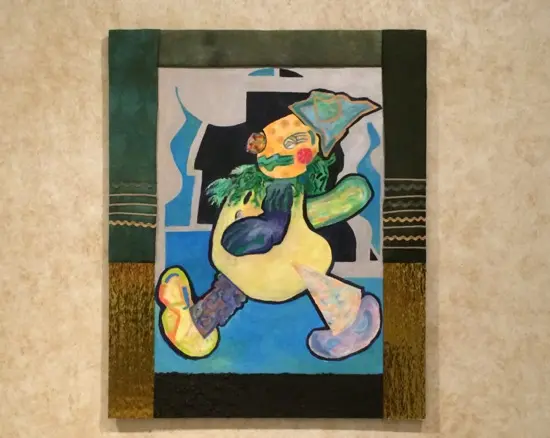 Inspired by mythology, science fiction, and Surrealist literature, Henderson investigates “shadow states and other realms of consciousness.” A series of paintings entitled Mourning Clowns, which encircle the scarecrow, are meant to depict “wandering fools in a land of plenty.”