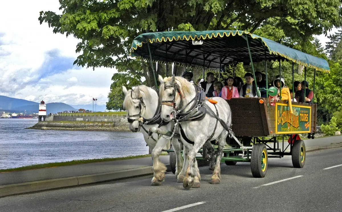 The only way to describe Stanley Park is that it is Vancouver’s crown jewel. It is so beautiful and I love walking around it along the Seawall and through it along the paths winding through the forest. I do this a lot. But as fun as I’ve always thought the horse-drawn tours look, I’ve never hopped on one. Shame on me, because it was a great way to see the park and I learned at least five new things about the area and history. And how posh did my friends and I feel being pulled along by two handsome grey Percheron horses? Very.