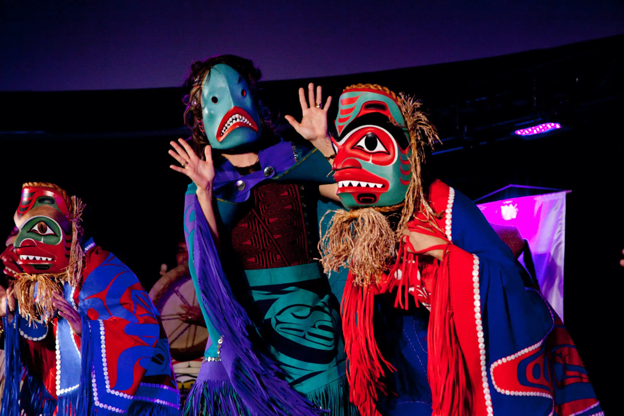 In addition to signature presentations from Sámi artists from Norway and Sweden, this year’s festival welcomes performances from 15 Indigenous groups from throughout British Columbia, Washington, Alaska, the Yukon, and Ontario. Returning to the program includes numerous festival favourites: dynamic dance group Chinook Song Catchers (Skwxwu7mesh, Nisga’a); Squamish-based Spakwus Slolem (Skwxwu7mesh); mask-dancing groups Git Hayetsk (Nisga’a, Tsimshian) and Git Hoan (Tsimshian); a family group from many First Nations Xwelmexw Shxwexwo:s (Stó:lō, Musqueam, Sts:ailes, Snuneymuxw, Nuu-chah-nulth, Skwxwu7mesh); Rainbow Creek Dancers (Haida), in celebration of traditional Haida ceremonial dances; the return of Tooma Laisa and Leanna Wilson, drum dancers and throat singers of traditional Inuit songs; the award-winning Inland Tlingit Dakhká Khwáan Dancers; Yisya̱’winux̱w, a group representing many of the 16 tribes of the Kwakwa̱ka̱’wakw people; Chesha7 iy lha mens (Skwxwu7mesh, Stó:lō, Tsimsian), a family group of grandmothers, mothers, and daughters; Kwhlii Gibaygum, a highly energetic group representing the Nisga’a people of the Nass River valley in Northern British Columbia; and Dancers of Damelahamid (Gitxsan, Cree), whose performance will focus on the strength of Indigenous Elders in carrying artistic practices through the generations