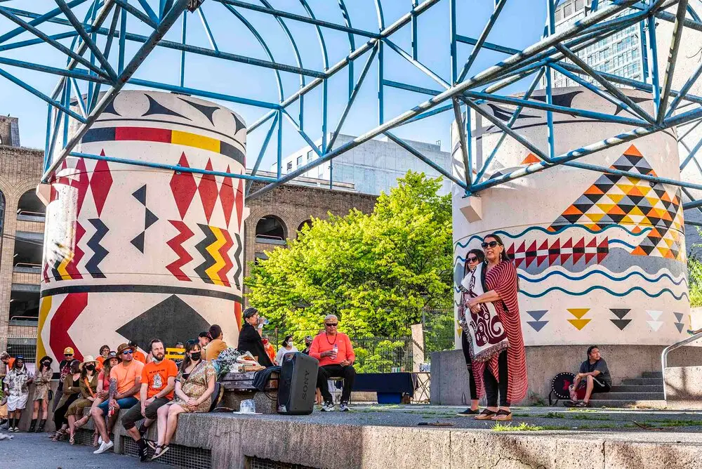 Part of the richness of VMF is its attention to a sense of place, and the history, cultural heritage, and present artistic work occurring on it. A really exciting project is “Blanketing the City IV: Cathedral Square,” part of an ongoing reconciliation initiative that began in 2018. Led by Musqueam weaver and graphic designer Debra Sparrow, the project aims to spotlight Coast Salish weaving and its crucial cultural role that has been ignored and devalued for so long. This year’s instalment involves master weavers Chief Janice George and Angela George who designed 7 murals to cover the concrete pillars of Cathedral Square, a downtown space that is situated above an underground BC Hydro sub-station. The murals are striking, beautiful, and symbolic of the re-empowerment of Musqueam, Squamish, and Tsleil-Waututh visual culture in Vancouver.