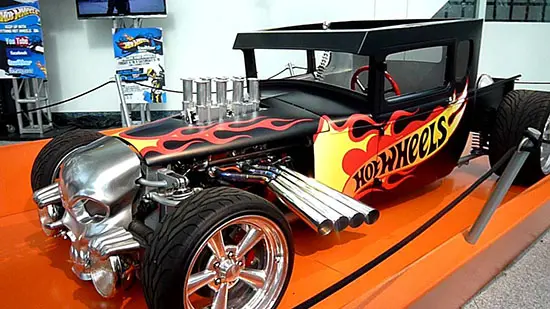 - Hot Wheels ‘Bone Shaker’: With a skull grille, zoomy pipes, and injector stacks through the hood, this rat rod was made to shake your bone-bones! The car is complete with a skull face piece and hands gripping the headlights; a skull topped spine shifter and skull and crossbones steering wheel. Under the Hot Wheels flame paint job, is a 402 hp short block Chevy 350 cl with 350 lb/ft torque. Bone Shaker is one scary hot rod, inside and out.