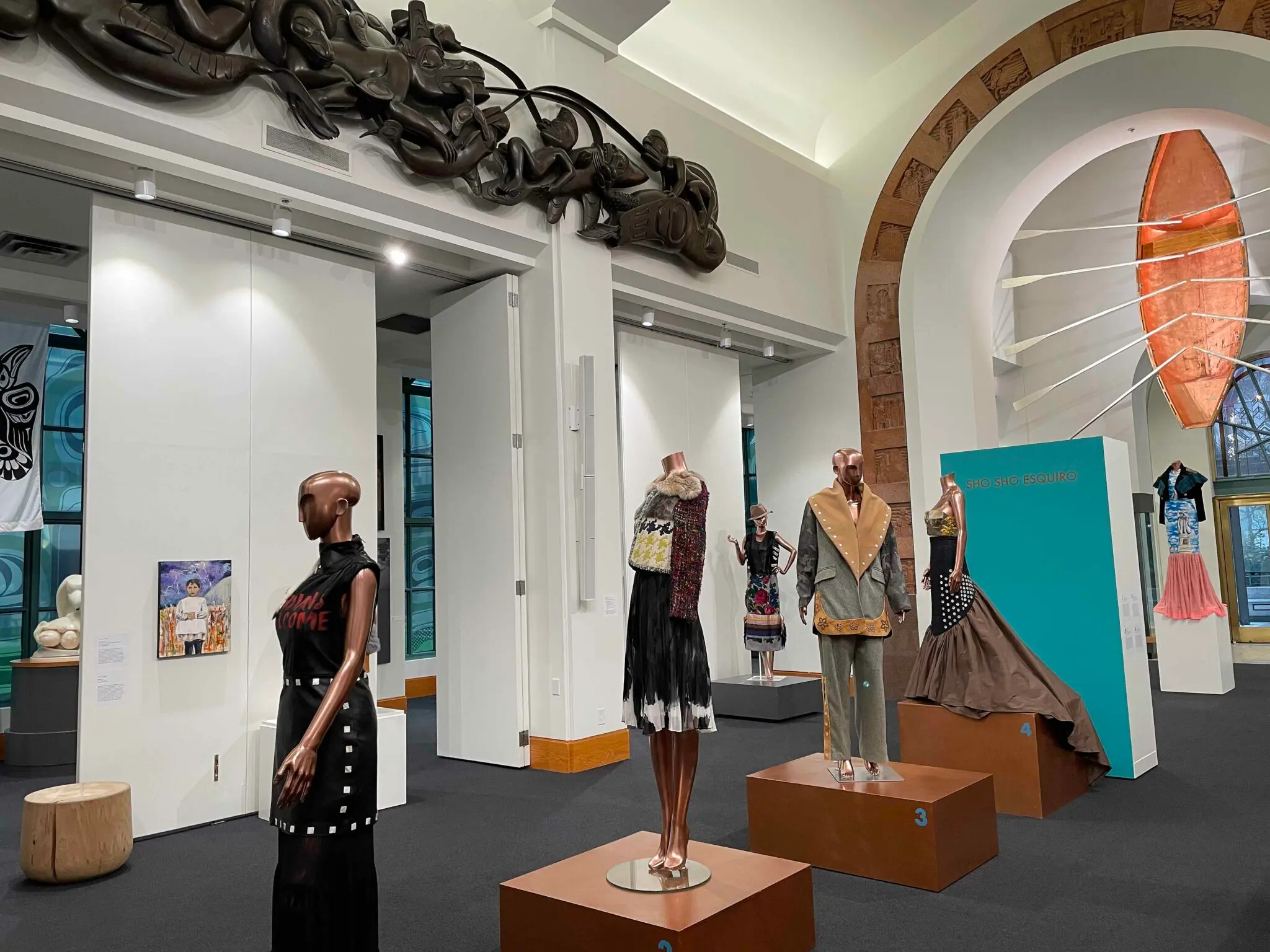 Running until June 5, Sho Sho Esquiro: Doctrine of Discovery, guest curated by Miranda Belarde-Lewis, spotlights the creations of fashion designer, textile artist, and activist Sho Sho Esquiro. The title of the exhibition refers to a Papal decree that in 1493 falsely allowed Europeans to claim land and water they supposedly “discovered,” completing ignoring those already there. The exhibition, through beautifully striking gowns and outfits, explores continuing impacts of colonialism on First Nations communities, as well as both resilience and resistance to oppression. “This is a powerful exhibition that is really resonating with a lot of people,” says Carter.