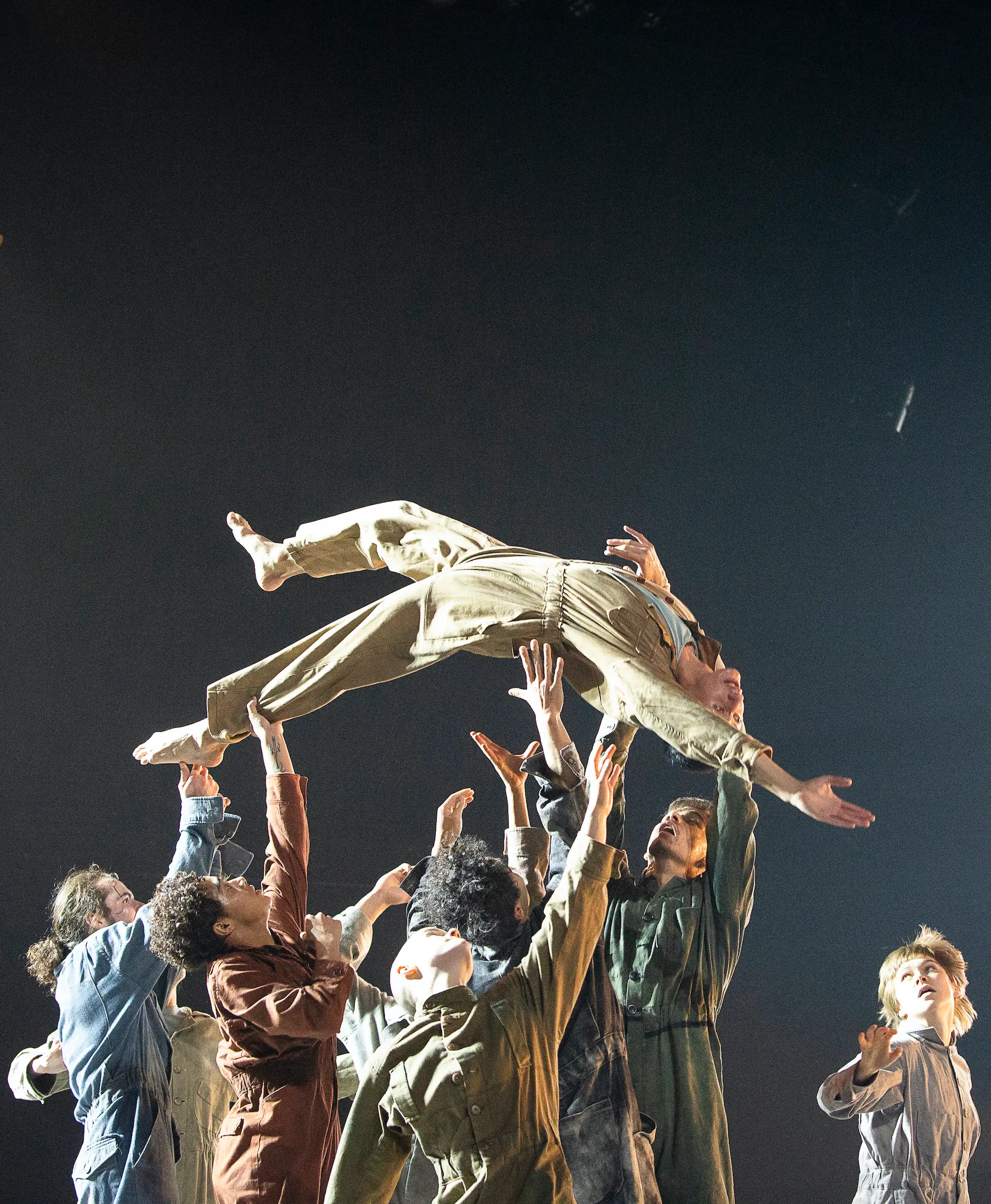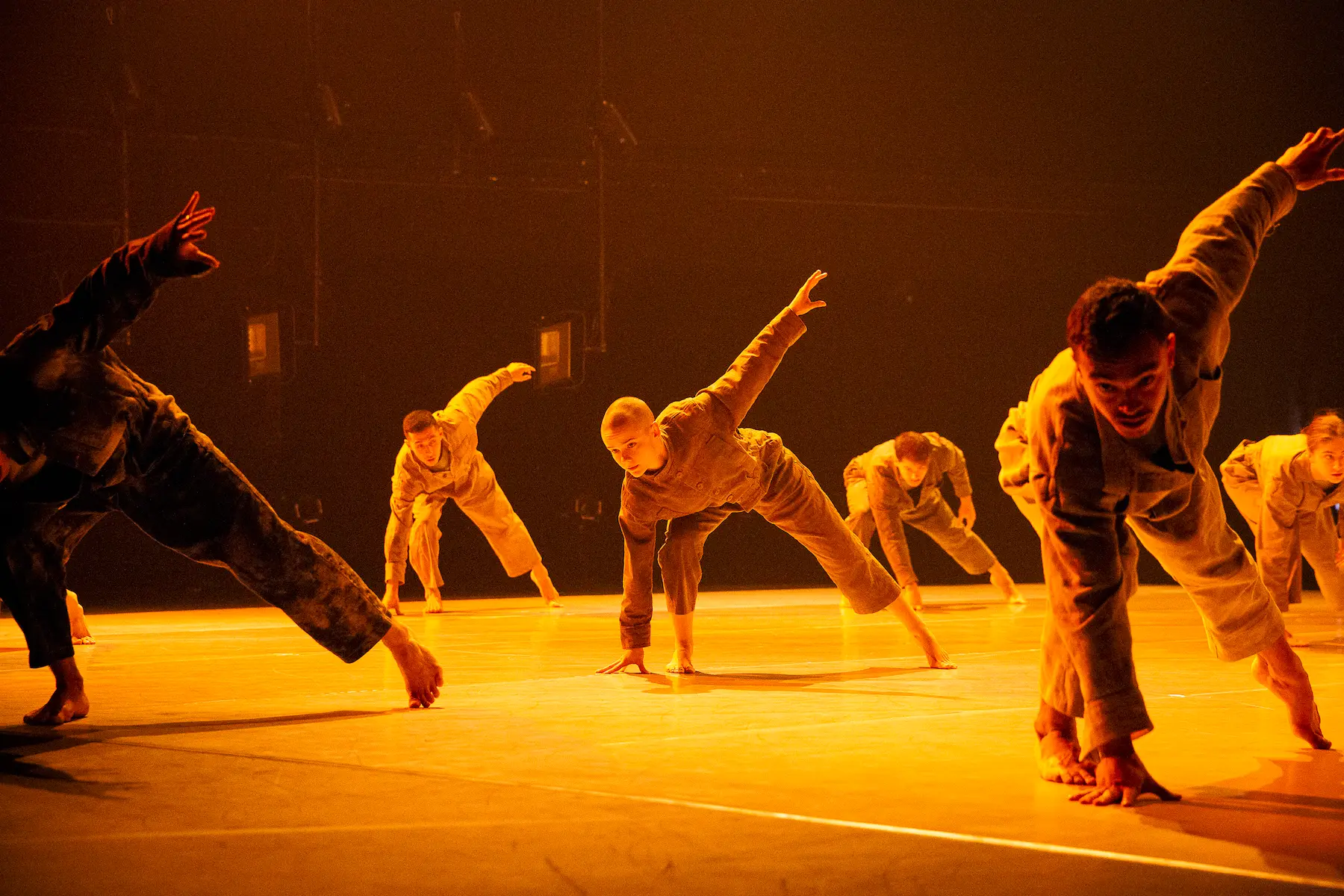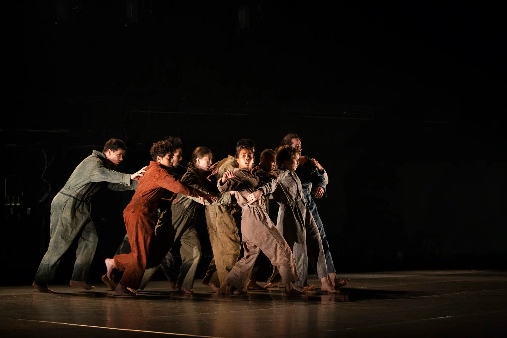 The work begins with the company’s dancers lying face down on an unadorned black set. As tension mounts, movement slowly ripples through the pack as the dancers bubble up, one at a time, in a reflexive chain reaction. Through innovative partnering, staccato flashes of fiery red and stark white lighting, and powerful, urgent movement, the dancers fight their own instincts, stripping away their constraining boiler suit uniforms on the path towards emotional freedom and transformative enlightenment.