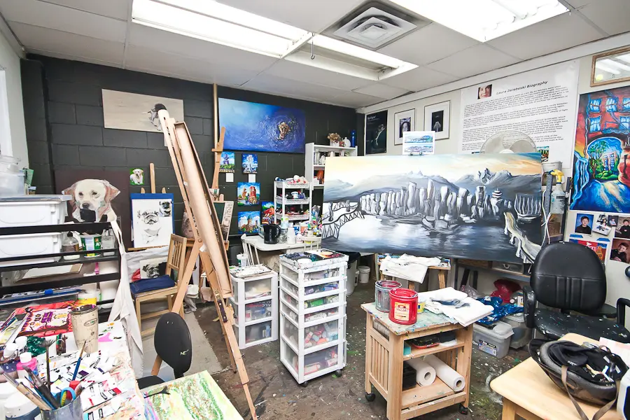 The City Centre Artist Lodge houses over 100 artists, who you can make appointments to visit. Alternatively, some of them have an open-door policy when they’re in. You can also visit participating artists on First Saturdays, which are open studio days on the First Saturday of every month for studios across the city. Centre Centre features a north and a south building. In the south building, you’ll find artists like Lukas Lundberg, who specializes in vibrant murals and paintings of people and animals; Mallory Donen, who produces embroidery and digital art; Niki Brown, a floral and multimedia artist; Enigma Arcana, who does custom design; Elana Sigal, who creates jewelry, photography, and textiles; and Hayley Nicole Crichton of Happy Nomad Candles, who makes inventive candles. And in the north building, you’ll find Paulo OConnor of Mnemonic Design Labs, a visual design artist who plays with lines and shapes, notably in an Icons series of well-known Vancouver landmarks; and Tracy Anne Northey, a visual artists who produces both abstract and more realist art.