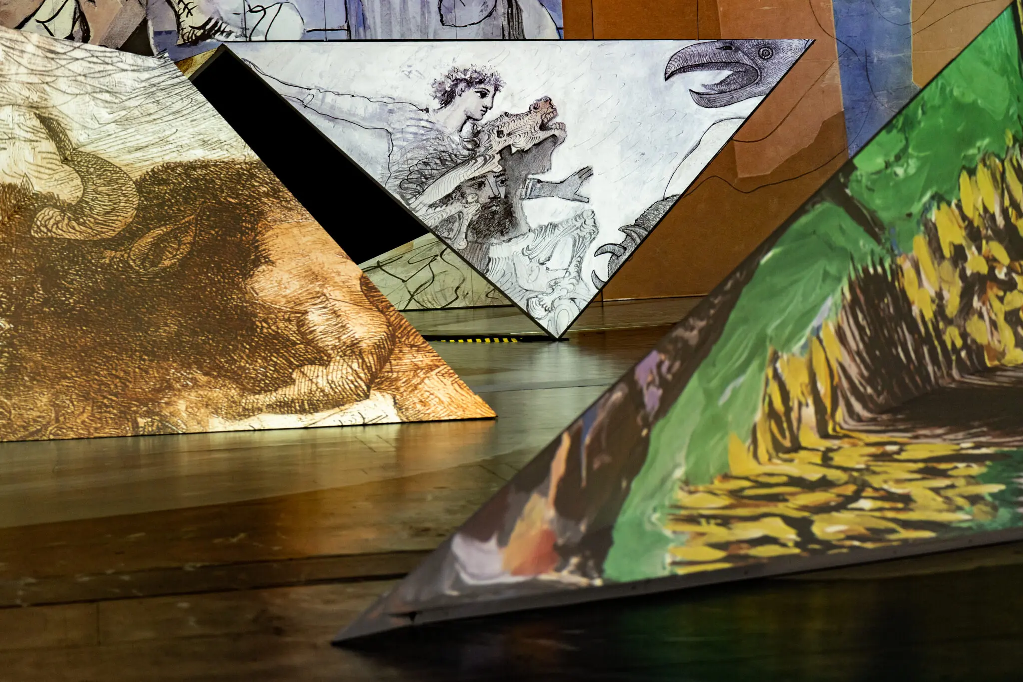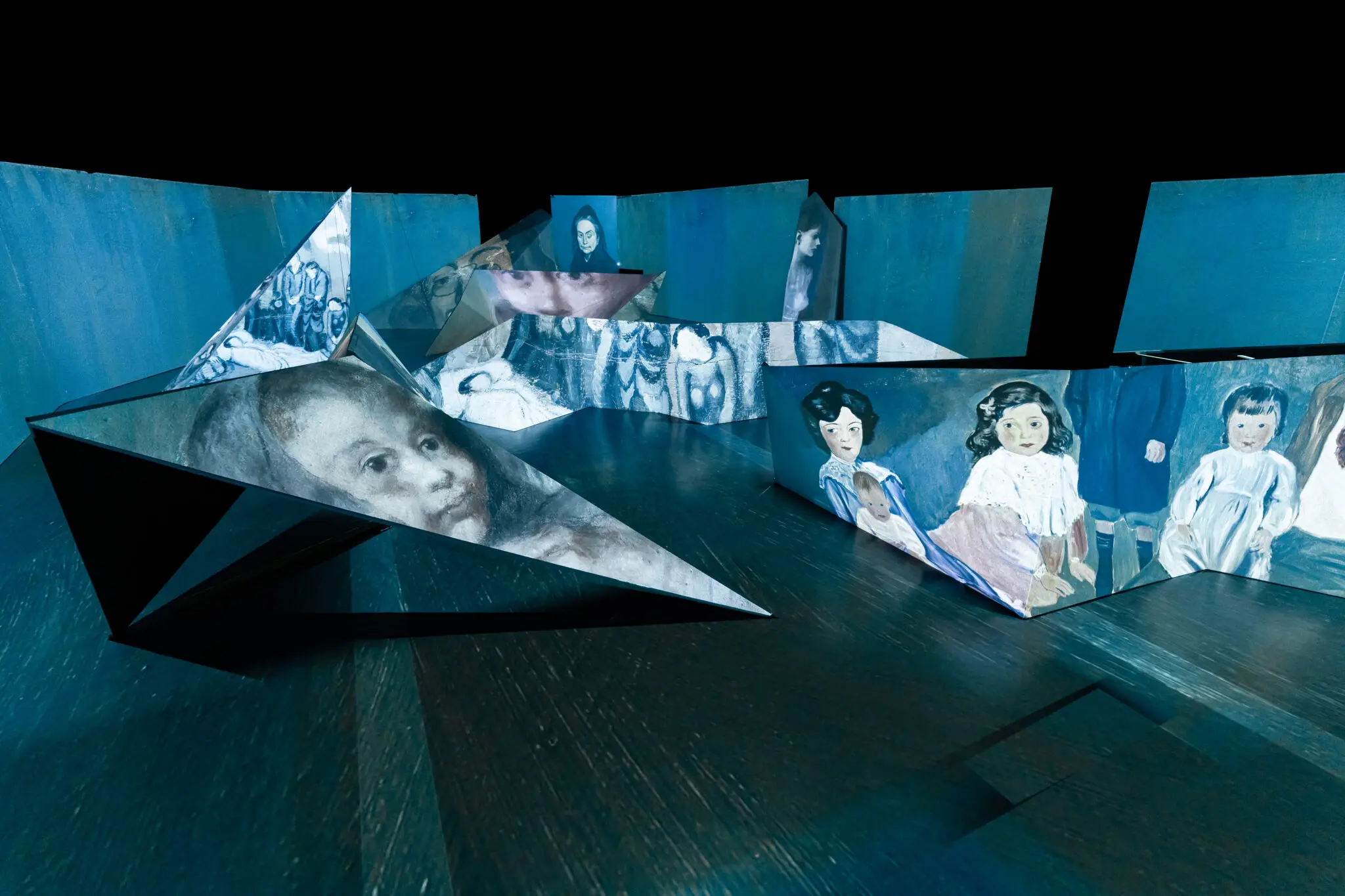 Imagine Picasso offers an unprecedented dialogue between Ricciotti—winner of the National Grand Prix in Architecture—and one of the greatest painters of the 20th century. Ricciotti was inspired to create this spectacular scenography from the paper sculptures Picasso made for his children. The paintings, projected onto nine full-blown Origami-style structures, offer a unique and novel perspective on the work of Picasso.