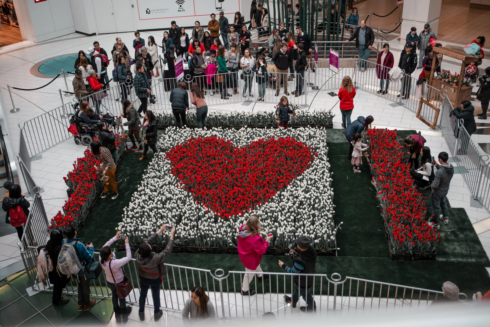 From 10am to 11am, visitors to Metropolis at Metrotown will be able to view 14,000 live tulips (yes, 14,000!) located in the Grand Court. The tulips will be in viewing range from each of the three levels of the mall. From high up, visitors will particularly be able to see the heart formations of the thousands of flowers.