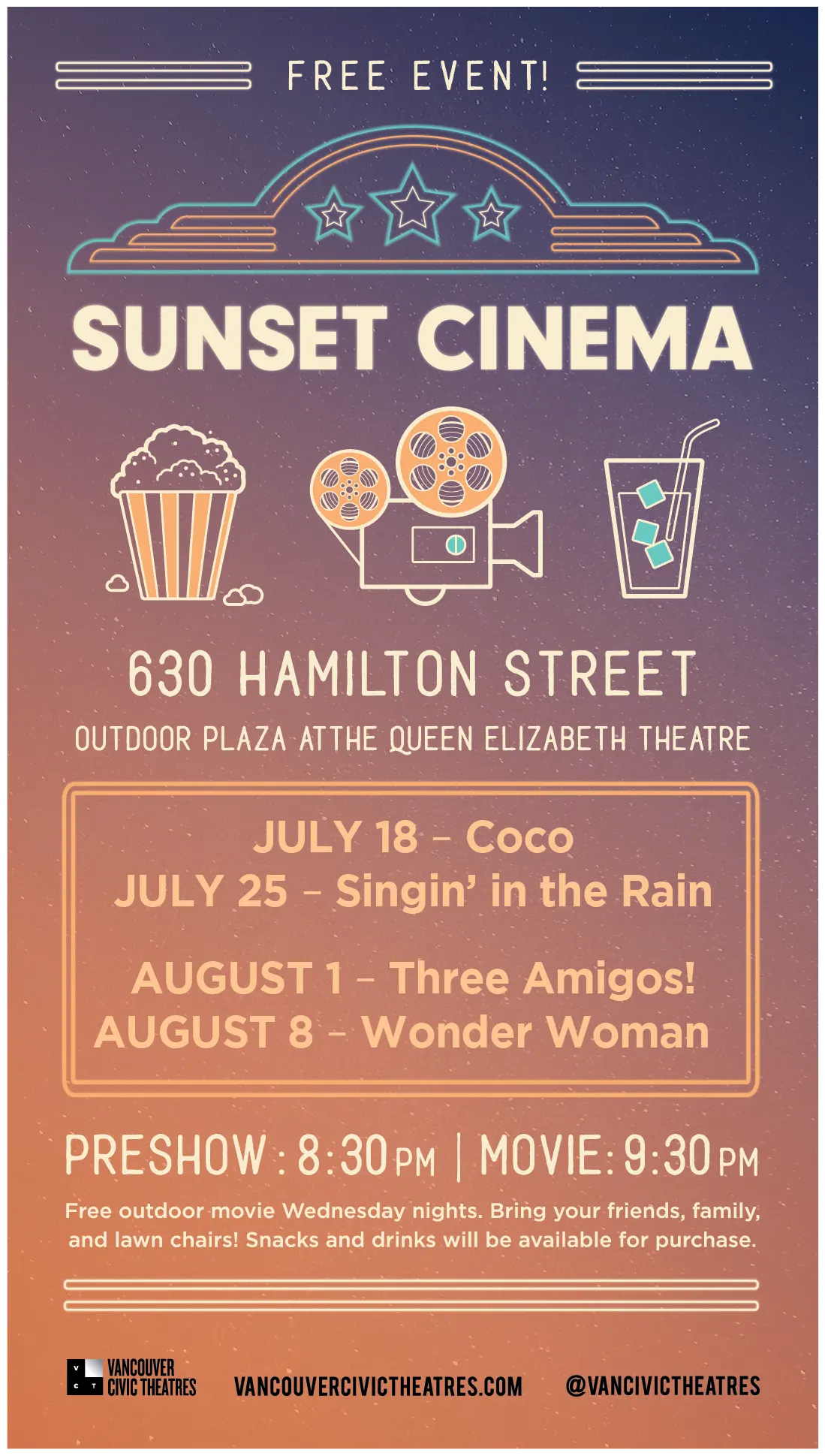 Film fans, take note: Sunset Cinema, the free outdoor movie series guaranteed to liven up date night, family time or BFF hangouts, will once again be hosted at the Queen Elizabeth Theatre plaza on select nights throughout summer.