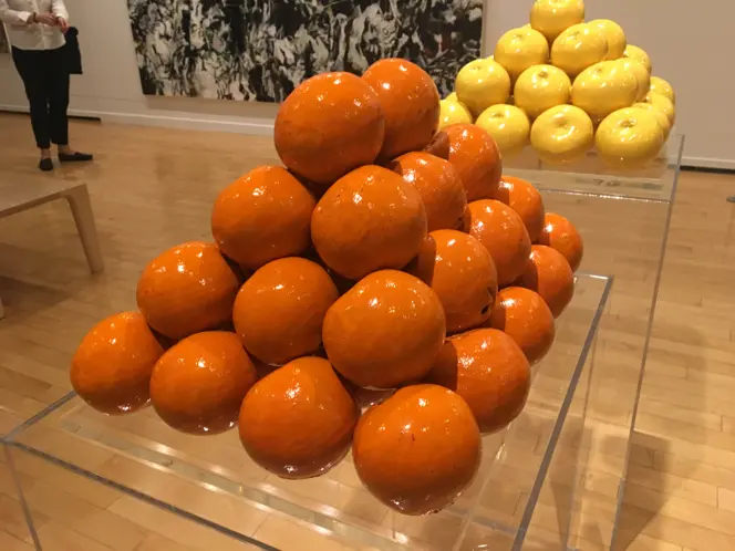 As the visitor moves into the third and final room, they will be struck by Gathie Falk’s 40 Oranges (1969-1970) and 30 Grapfruit (1970), sculptures of citric fruits seemingly levitating in the air. In this gallery space, Thom chose works that illustrate artists playing with the potentials of wood, tapestry, and paint. An especially arresting piece is one by Gordon Smith, Untitled (1996), a large acrylic on canvas that with its strokes of paint, drips, and foot-printed traces makes the physicality of paint the focus of the viewing experience.