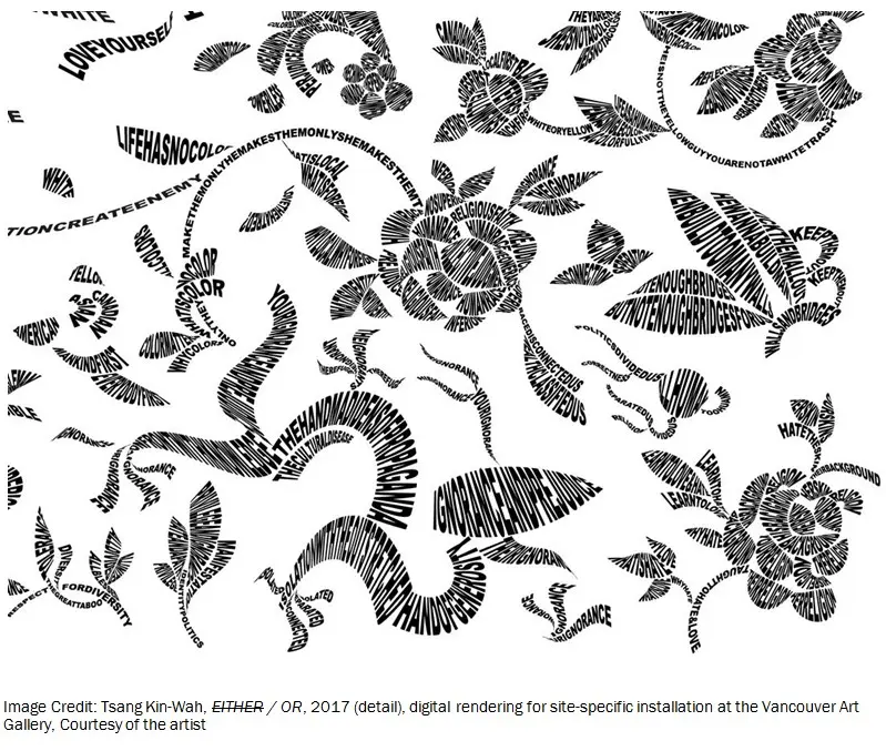 What: This large-scale composition transforms English texts to form intricate floral and animal patterns. The work draws from discriminatory language that appeared in newspapers and political campaigns in Vancouver during the 1887 anti-Chinese riots, the mid-1980s immigration influx from Hong Kong and most recently, the heated exchanges around the foreign buyers and the local housing market.