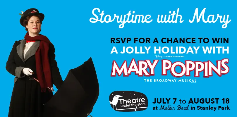 What: In celebration of the 2017 production of Mary Poppins, running July 7 – August 19 at Stanley Park’s Malkin Bowl, TUTS offers children an opportunity to meet the star, Mary Poppins (played by Ranae Miller) who will read from the Disney storybook, sign autographs and take photos with young fans.