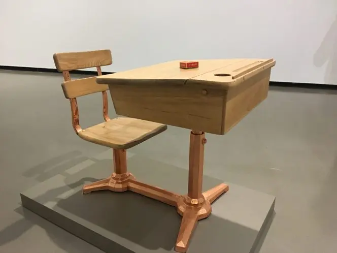 Assu’s work Leila’s Desk (2014) speaks to Canada’s colonial past and present in its reclaiming of desks from residential schools, in this case a desk that Assu’s grandmother might have sat at during her time at an “Indian Day School.” The box of Lifebuoy soup on its lid connects to a “Dirty Indian” racist prank that she experienced when she attended public high school for the first time. Assu displaces this desk to the Gallery where the visitor can reflect on histories of mistreatment and prejudice within Canada.