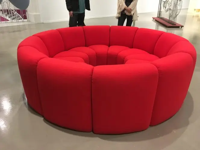 Ken Lum’s piece Untitled (Red Circle) (1986) looks, at first, like an inviting red couch until the viewer realizes there is no point of entry, that the seating actually excludes the one who wishes to sit down.