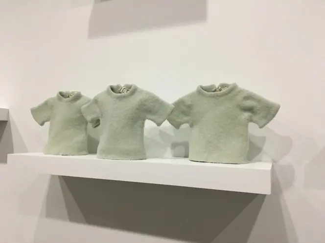 Sweaters are familiar, unthought of things that are pulled out of drawers and put on in a rush. Winnipeg artist Aganetha Dyck in Eaton Triplets (1976-1981) spotlights them by displacing them doubly: first, shrinking them repeatedly in the washing and drying cycle until they become aesthetically doll-like, and, secondly, moving them into a gallery space where they are viewed, as opposed to worn.