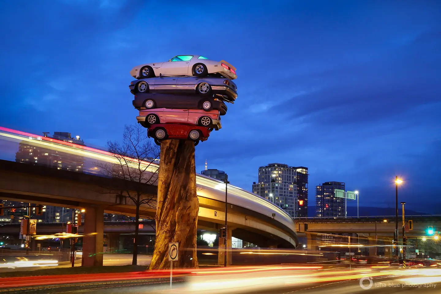 One particularly provocative piece is Vancouver artist Marcus Bowcott’s Trans Am Totem, which originally was located at Quebec Street and Milross Avenue, near Science World. The installation is composed of an old growth cedar tree stump with five scrap cars stacked on top of it. The tree comments on unceded Indigenous territory, as well as the local forestry and wood processing industries. “The cars talk about consumerism. We like to buy bright shiny things but what about reusable culture versus consumer culture,” says Smaller. The installation, which was originally part of the 2014-2016 exhibition is now in the City of Vancouver’s collection of public art. It is being refurbished elsewhere and will find a new home in Summer 2022.
