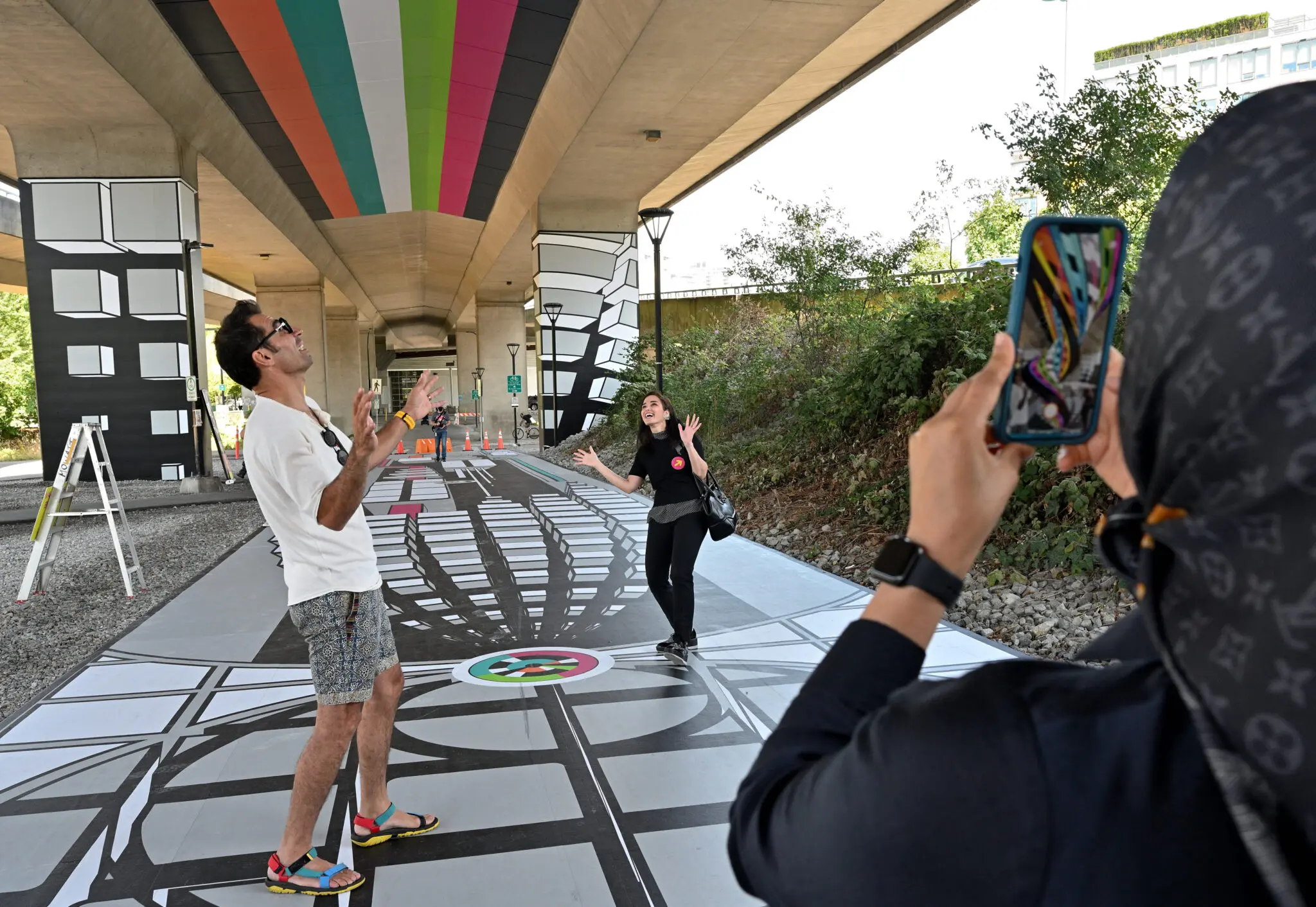 Voxel Bridge is the exciting culmination of this reimagining. Columbian-born artist Jessica Angel completed two artistic residences with the Vancouver Biennale. Out of it emerged a public art installation that combines the largest outdoor vinyl mural in the world (19000 sq. ft.) with blockchain-based augmented reality (AR). The mural itself is located on the underside of the south side of the Cambie Street bridge. The mural alone, with its strong geometric lines and bright colours, is already engaging but Voxel Bridge takes the mural to the next dimension with an overlaid virtual experience.