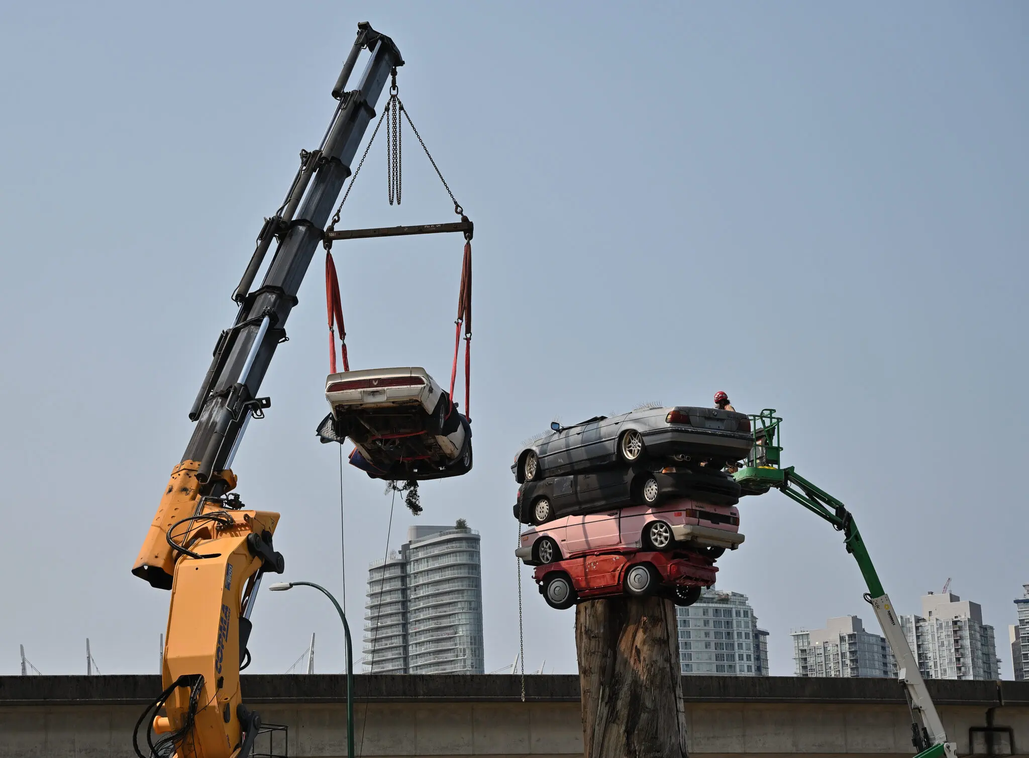 For each piece of public art, Vancouver Biennale has to talk with the city to see where they have available space that’s suitable for the dimensions and requirements of a given piece. “It’s about reflecting the space. If it’s really tall, you can’t have it in some smaller areas since it will block people’s view and people’s transit around there,” says Smaller, adding, “Where it sits is one thing, but you also have to transport it in. So, if it’s in the middle of some area but you can’t get the big truck and the crane in there, it’s going to be a no go.” For example, over the course of a day, it took cranes, flatbed trucks, and a dozen workers to deinstall Trans Am Totem for refurbishment.
