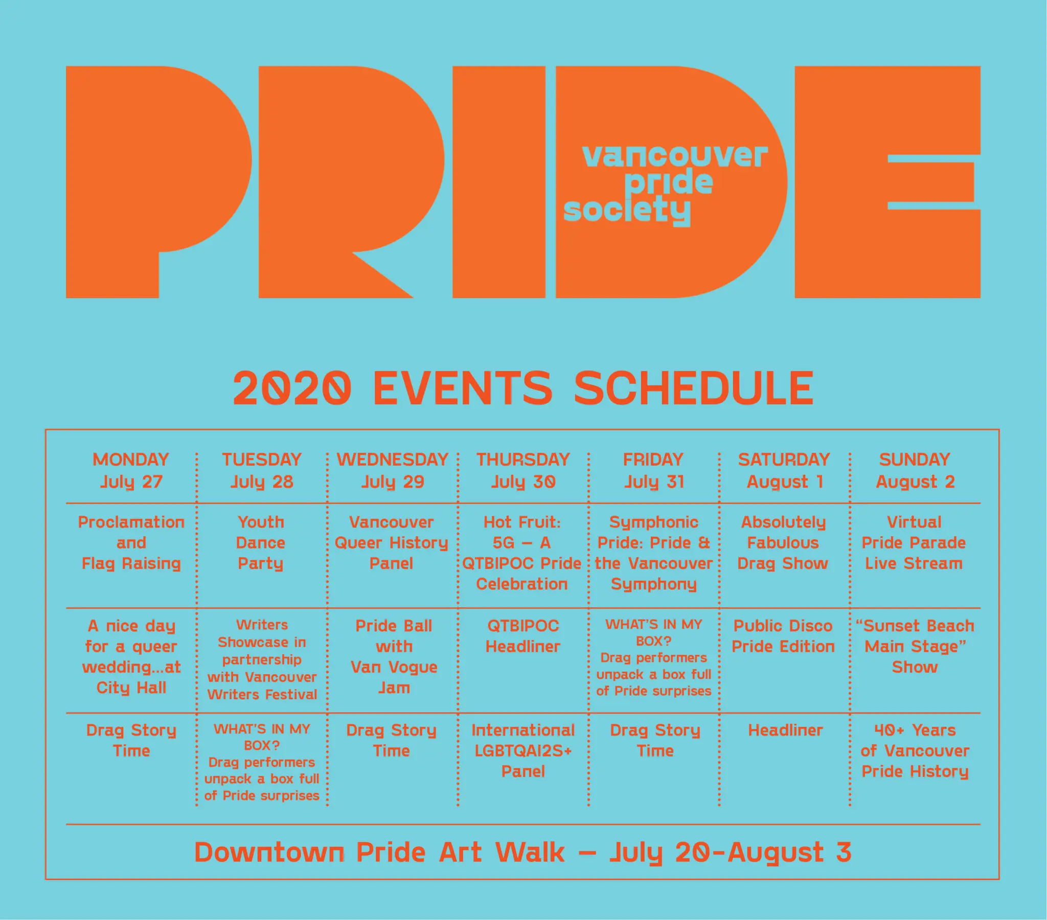 “I am excited about our new collaborations this season,” says Andrea Arnot, Executive Director of VPS, “We are partnering with the Vancouver Symphony Orchestra to bring you a variety talent show extravaganza and with the Vancouver Writers Festival to produce a queer Writers Showcase.” VPS will also be producing events that delve into LGBTQAI2S+ history in Vancouver. “Now people from all over the world can tune into Vancouver Pride festivities and events. Pride can not be cancelled, only reimagined.”