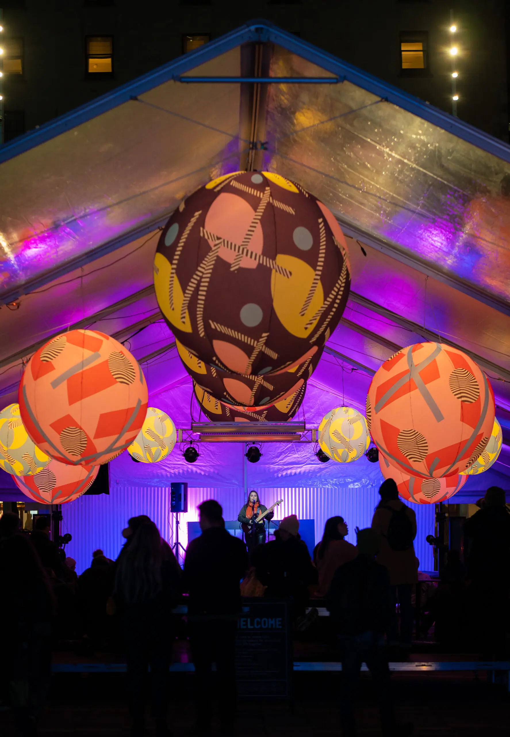 Enjoy the festival’s all-ages, outdoor venue featuring interactive art and free daily live entertainment in a heated, covered outdoor stage area, licensed pop-up bar and café, rotating food trucks, market vendors, and UV face painting.