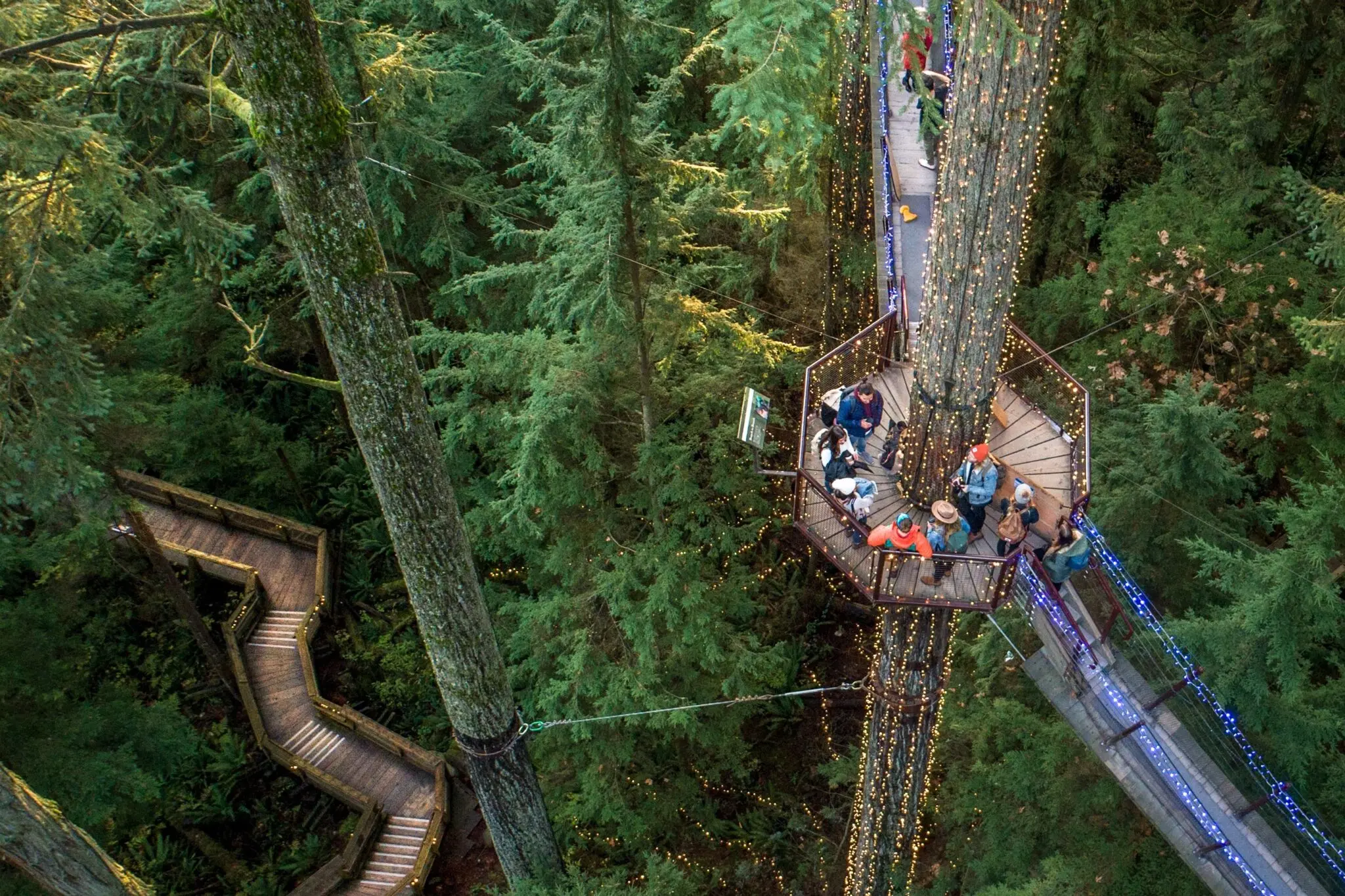 Canyon Lights transforms Capilano Suspension Bridge Park into a fun, family-friendly, and festive light experience. Cross the famous bridge, lit end-to-end with multi-colour lights above the illuminated Capilano River and canyon. Step into a magical glowing rainforest and walk high above the forest floor on the glittering Treetops Adventure before winding your way along the twinkling cliffside pathway of the Cliffwalk.