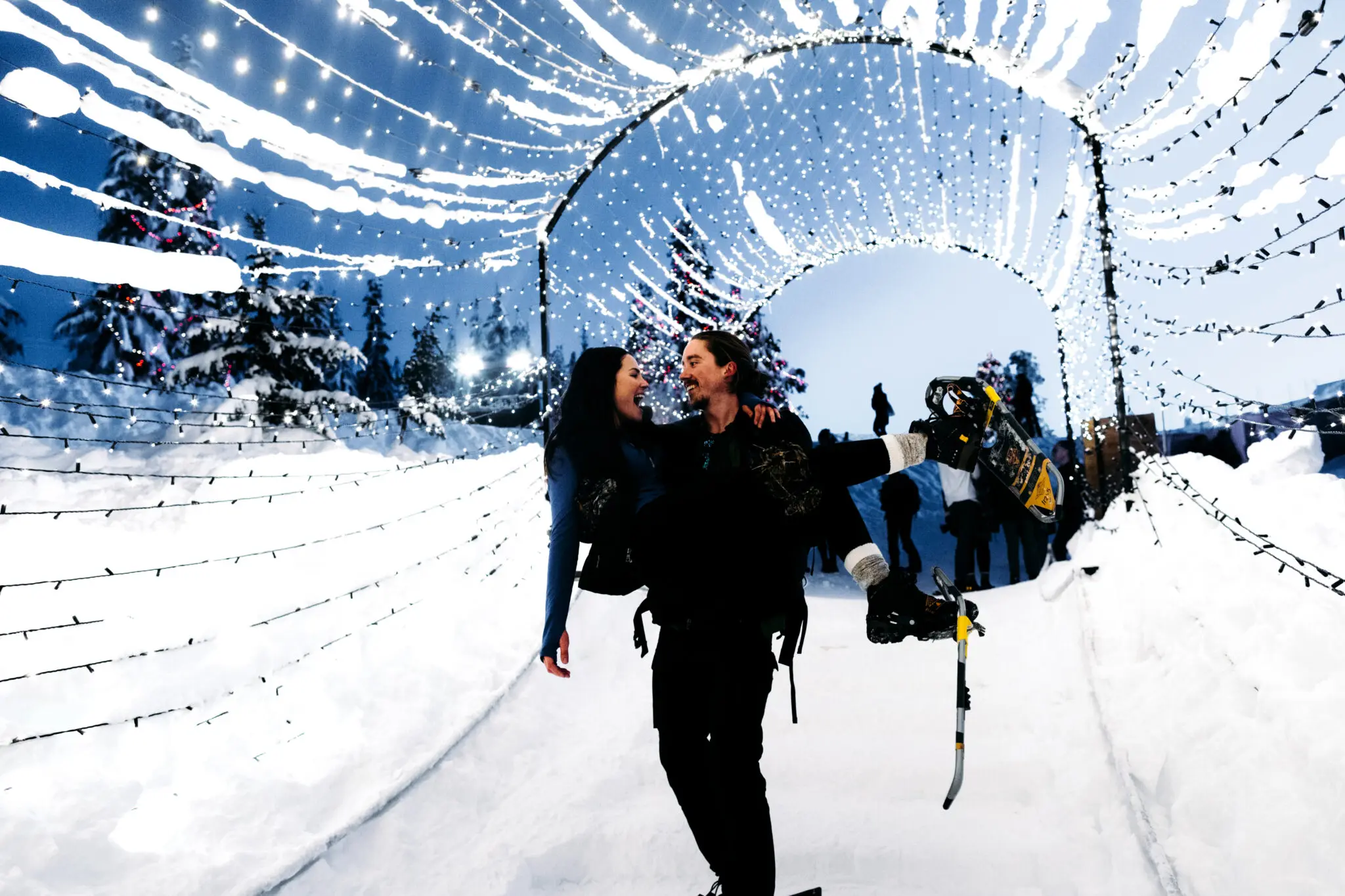 Take a spin on Grouse Mountain’s 8,000-square foot outdoor mountaintop Skating Pond surrounded by snowy trees adorned with glimmering lights.