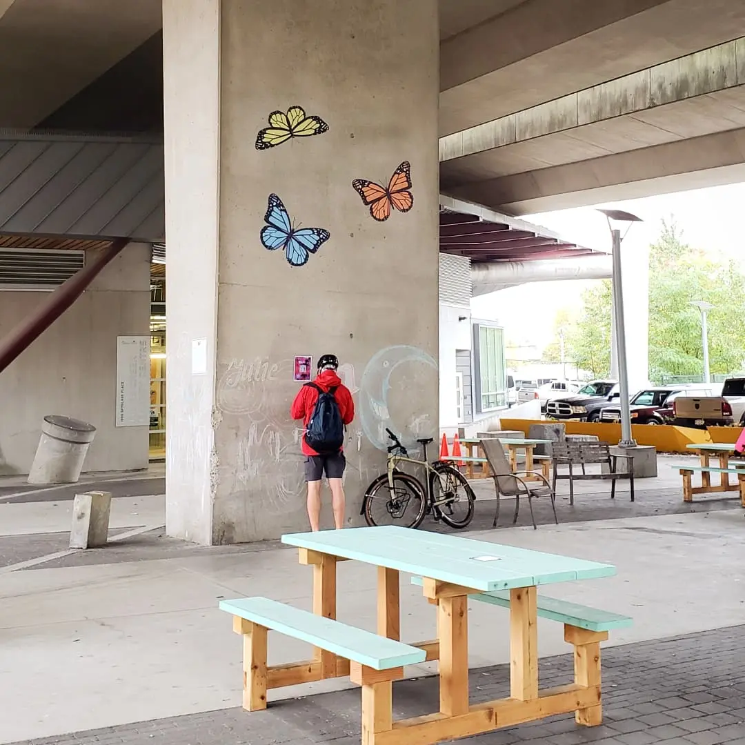 While monarch butterflies are black and orange, Chan drew inspiration from the colours of pre-existing chalk drawings on the pillars by making cheery purple, blue, and yellow butterflies. She also placed the butterflies above the chalk drawings so people could continue to add their own artwork to the pillars.