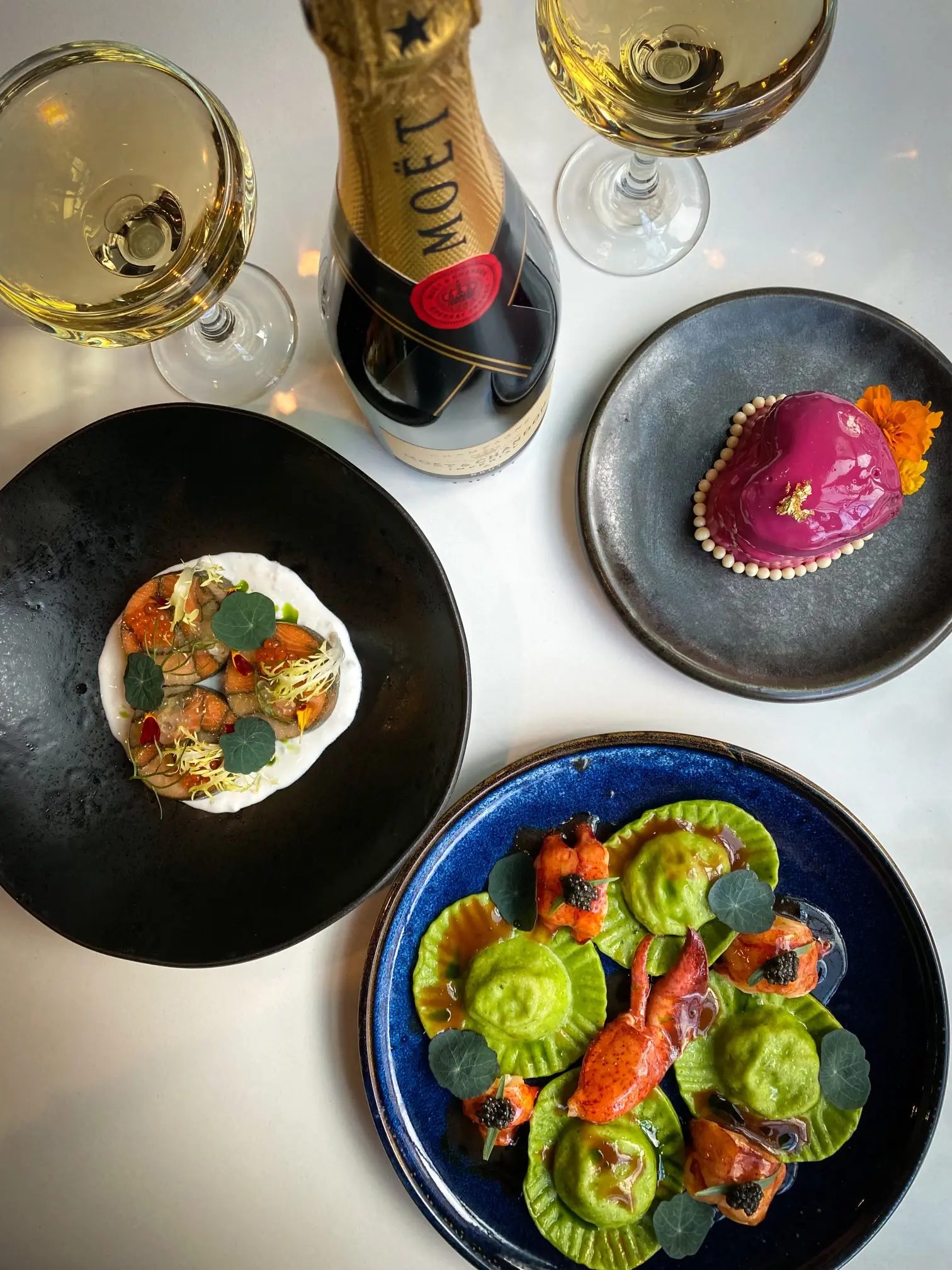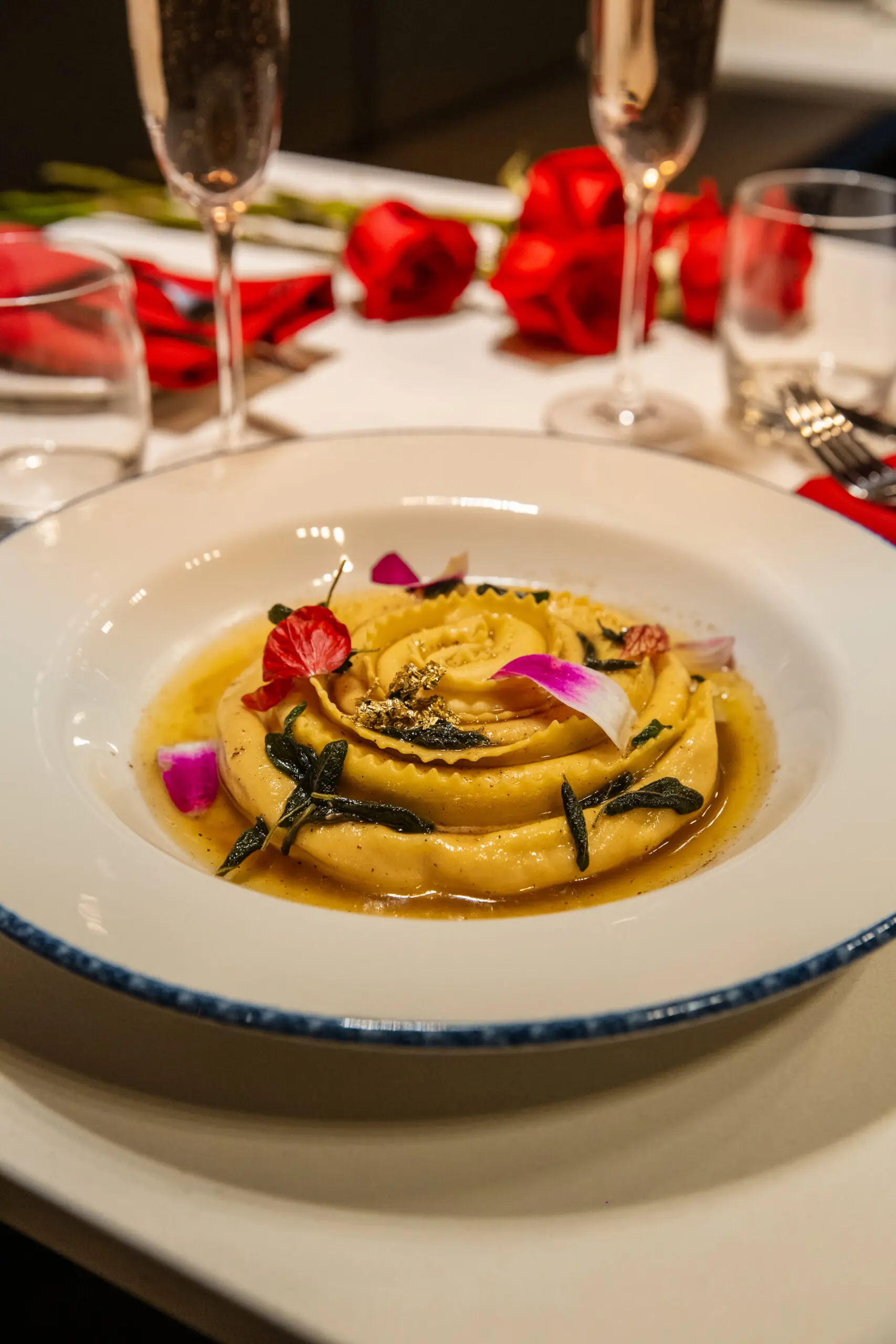 If you want to go big with a sumptuous Valentine’s meal to celebrate your love, Acquafarina is a wondrous option. The room is lofty and impressive, and its Italian cuisine is seductive. Later seatings are still available for their seven-course February 14 dinner ($195 per person, $95 for wine pairings). The evening starts with oysters and caviar before the next course of carrots and burrata with caramelized hazelnuts. The seafood course consists of scallop in the half shell with lobster dill salad before the pasta course of duck tortellini in consommé with parsley oil. Wild mushroom stuffed veal and creamy polenta with truffle will be the last savoury course before passion fruit chocolate ganache and almond sponge and petits fours.