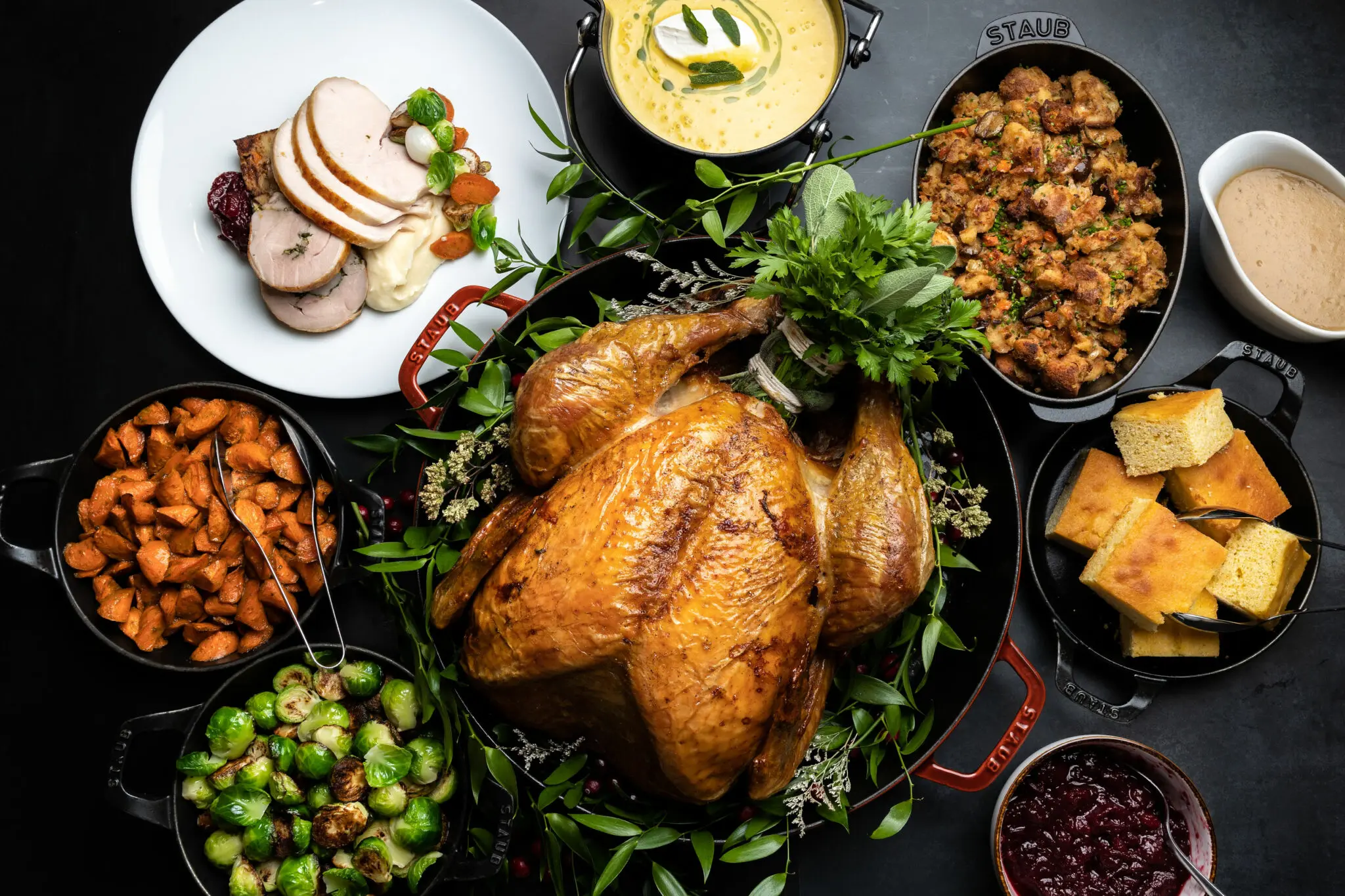 Bacchus Restaurant & Lounge always does a lavish holiday meal really well. This year, they’ll be hosting a Thanksgiving three-course dinner ($85 per adult, $55 for a two-course menu for children 12 and under). The meal begins with an amuse bouche of carved lox with potato rosti and crème fraiche before moving on to either marinated beets with burrata, fennel, cucumber, and arugula pistou or truffle mushroom consommé with cream of wheat dumplings and a medley of root vegetables. The main is slow-roasted sage turkey breast and roulade served with kale, red cabbage, caramelized chestnut and herbed stuffing, whipped potato purée, turkey gravy, and cranberry sauce before indulging in English sticky toffee pudding with brandy crème anglaise, spiced pumpkin ice cream and Chantilly cream. The meal closes with mignardise.