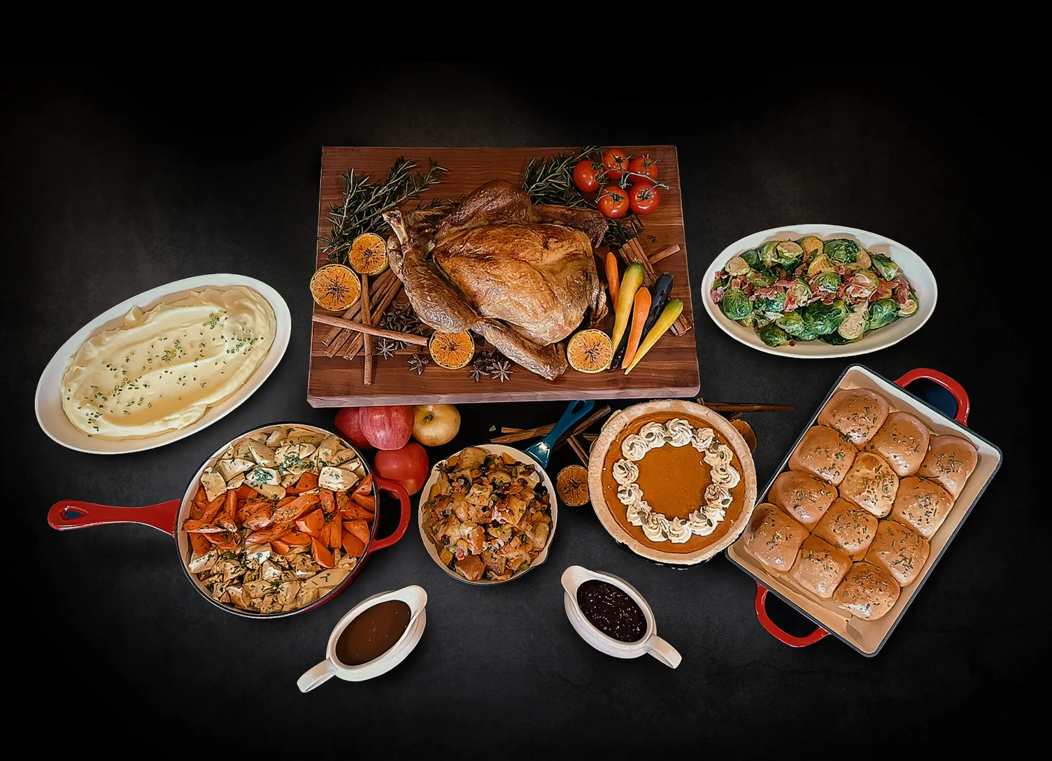 H Tasting Lounge in the Westin Bayshore in Coal Harbour is bringing back their Carvery To-Go menu (minimum 2 people, $55 per person). This Thanksgiving dinner consists of slow-roasted Fraser Valley white and dark turkey meat; dried apple, apricot, and cranberry brioche stuffing; Brussels sprouts with caramelized onion, bacon, and shallots; roasted maple glazed root vegetables; and buttermilk Yukon gold potatoes with chives. Pan gravy and cranberry sauce with orange and cinnamon are additional accompaniments. And make sure to save room for a slice of pumpkin pie with Chantilly cream. Otherwise, if you’re looking to host a larger group, they have a Takeout package with a whole turkey and the sides ($425, serves 8-10 people, needs to be reheated), which also comes with brioche rolls. Pick-up for the Turkey Takeout and Carvery To-Go will be October 8 from 2:30 to 6pm, with orders needing to be placed by October 5 at noon.