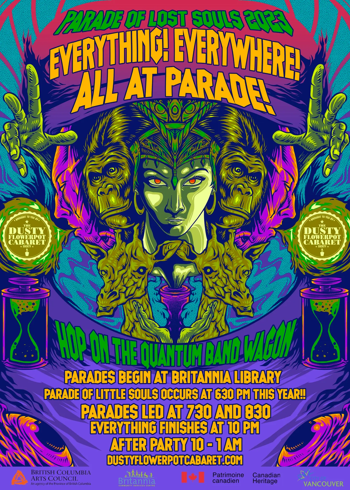 Commercial Drive’s beloved Parade of Lost Souls is back October 28, 2023, under the direction of The Dusty Flowerpot Cabaret. The event is three-fold, beginning with a family-friendly Parade of Little Souls at 6:30pm, a Parade of Lost Souls at 7:30pm and 8:30pm, and then a 19+ Lost Soul After Party from 10pm to 1am at the Wise Hall with visuals, performances, and live music. The parades start at Britannia Library and everyone is encouraged to join with their most elaborate Halloween costumes. The theme this year is Everything! Everywhere! All at Parade!, with music, art, and performance involved. The Dusty Flowerpot Cabaret is also holding multiple workshops before the big night, such as dance classes for “Thriller” and “The Time Warp,” in addition to witch dance classes for those interested in performing at the Parade of Lost Souls. It should be a magical and lively evening. More info and tickets for the After Party can be found here.