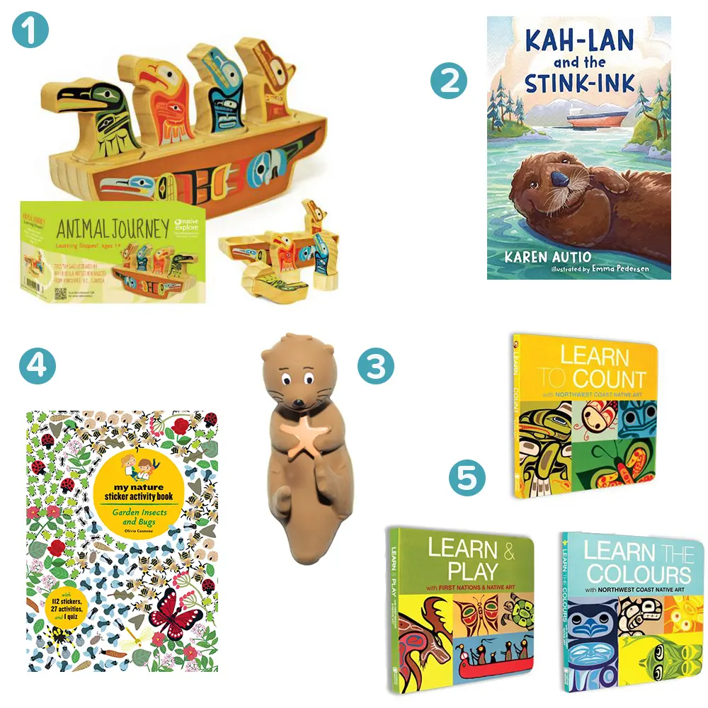 This game helps your child to learn the shapes with Northwest Coast animals, including Raven, Eagle, Wolf and Bear, all designed by Bella Bella artist Ben Houstie. It is made from natural pine, non-toxic paints and coatings, and soy-based inks. $16.80 | Museum of Vancouver