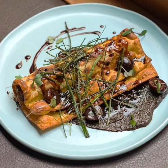 Another recommended pasta option (carbs call to me when the weather chills) is the game lasagna with braised goat and venison (what a combo!), handmade pasta, pickled cherries, mushroom and madeira purée, crispy leeks, and bordelaise sauce. Each bite of this intense dish is a reminder of what makes fall cooking so beguiling.
