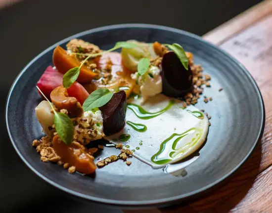 Case in point is a beetroot and burrata offering, which consists of fresh burrata, salt-baked beets, spiced maple granola, pickled Okanagan apricots, smoked yogurt, and basil oil. It’s the ultimate play with textures and a variety of balanced flavours (eg sweet, tangy, salty).