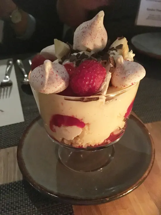 Don’t forget to save room for the decadent finish, either chocolate mousse with dark chocolate cake crumble, or an Eton mess, with raspberries, banana, vanilla, custard, sponge cake, cream, and meringue.