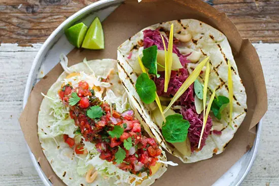 Tacofino, created in Tofino, BC in 2009 by Jason Sussman and Kaeli Robinsong, serves “Baja-by-way-of-West-Coast” cuisine with a handful of food trucks, and five brick-and-mortar restaurants (Tacofino Bentall on West Pender recently opened its doors in late summer 2017). Tacofino’s Blue Truck can be found at the corner of Robson & Howe and the White Truck can be found at Burrard & Dunsmuir. Try their signature fish taco with crispy pacific cod, salsa fresca and chipotle mayo or their walking burrito with red chorizo, valentia, cheese sauce and cilantro (menu varies by location).