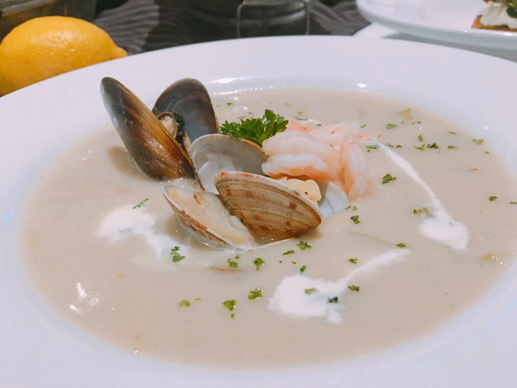 The seafood gorging begins with seafood chowder, a crab cake, or shrimp cocktail. Go with the hearty, creamy soup, which will immediately warm the hungry belly.