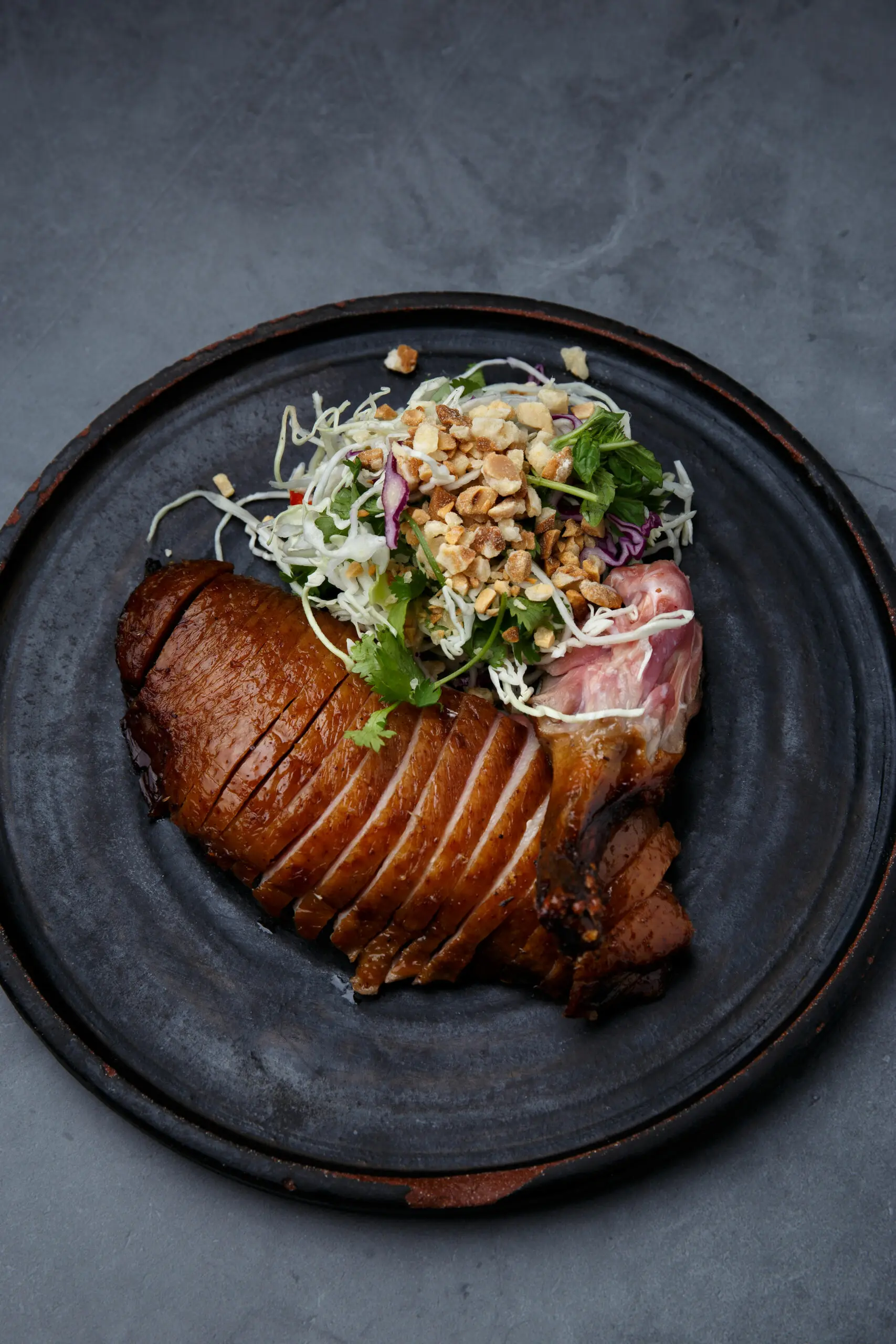The restaurant currently features a roasted Brome Lake duck breast that was inspired by Peking Duck. The duck is blanched in a flavourful stock, dry aged, and then roasted at a high temperature when a customer orders the dish. The rub is a familiar Chinese five-spice combination, with spices like cinnamon and star anise. Meanwhile, the coleslaw brings in other Asian flavours. “The coleslaw flavours are more Thai. It’s got fish sauce, lime juice, and candied peanuts with some Thai basil. The flavours are really well balanced,” says Kuan.
