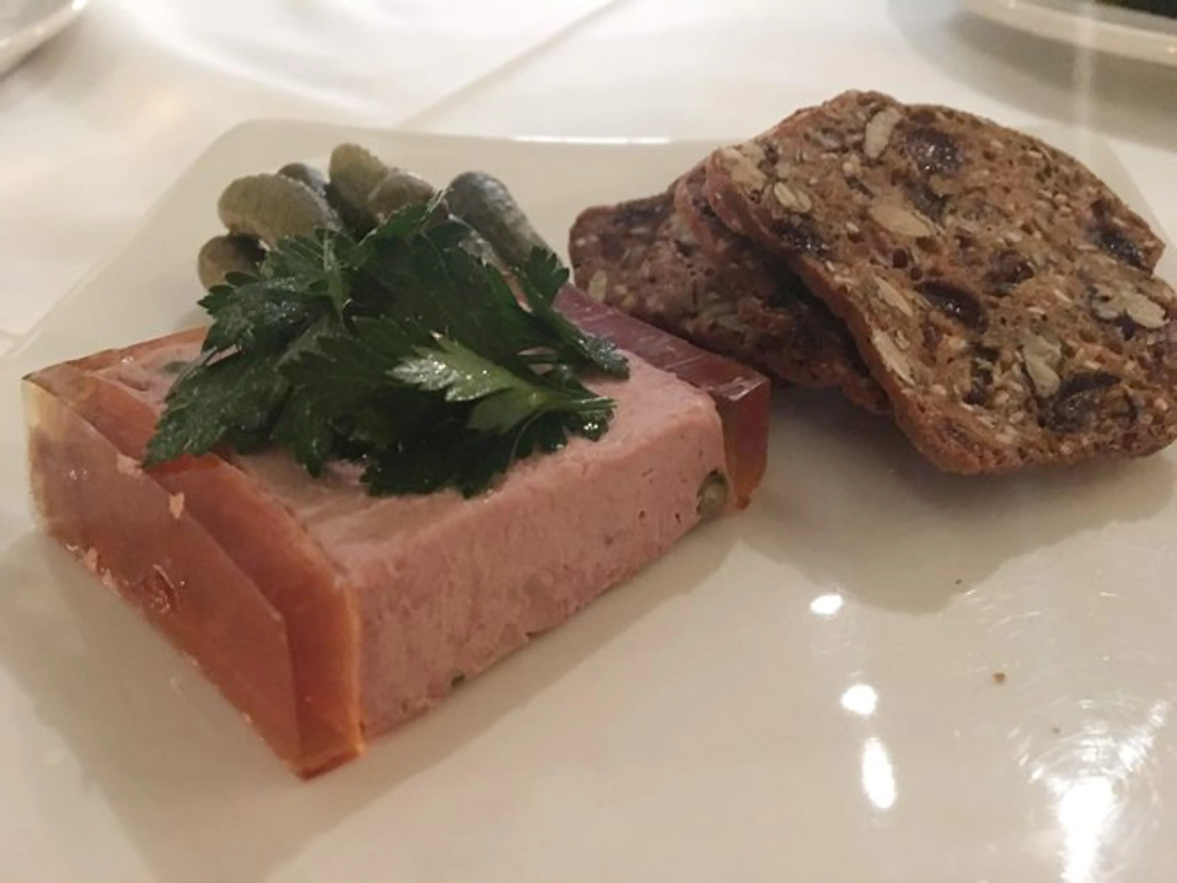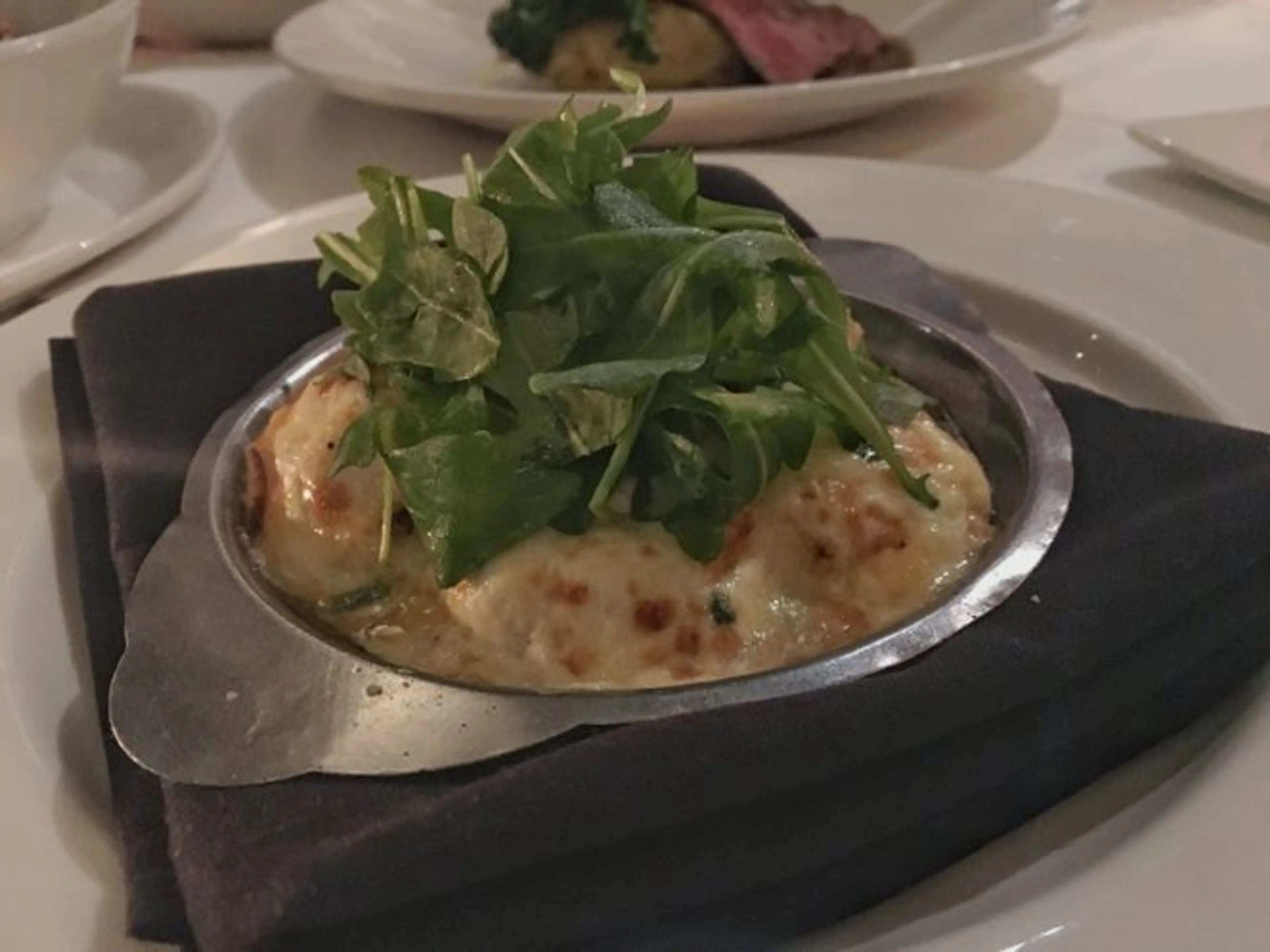 To start, you have a choice between mushrooms stuffed with crab, shrimp, and cream cheese; duck pâté with cognac, pork, herbs, butter, cream, egg, and lemon; and a salad with egg mimosa, Asiago, croutons, tomatoes, carrots, capers, tarragon vinaigrette, and sliced almonds. The stuffed mushrooms were richly delicious, a decadent treat to start off the meal.