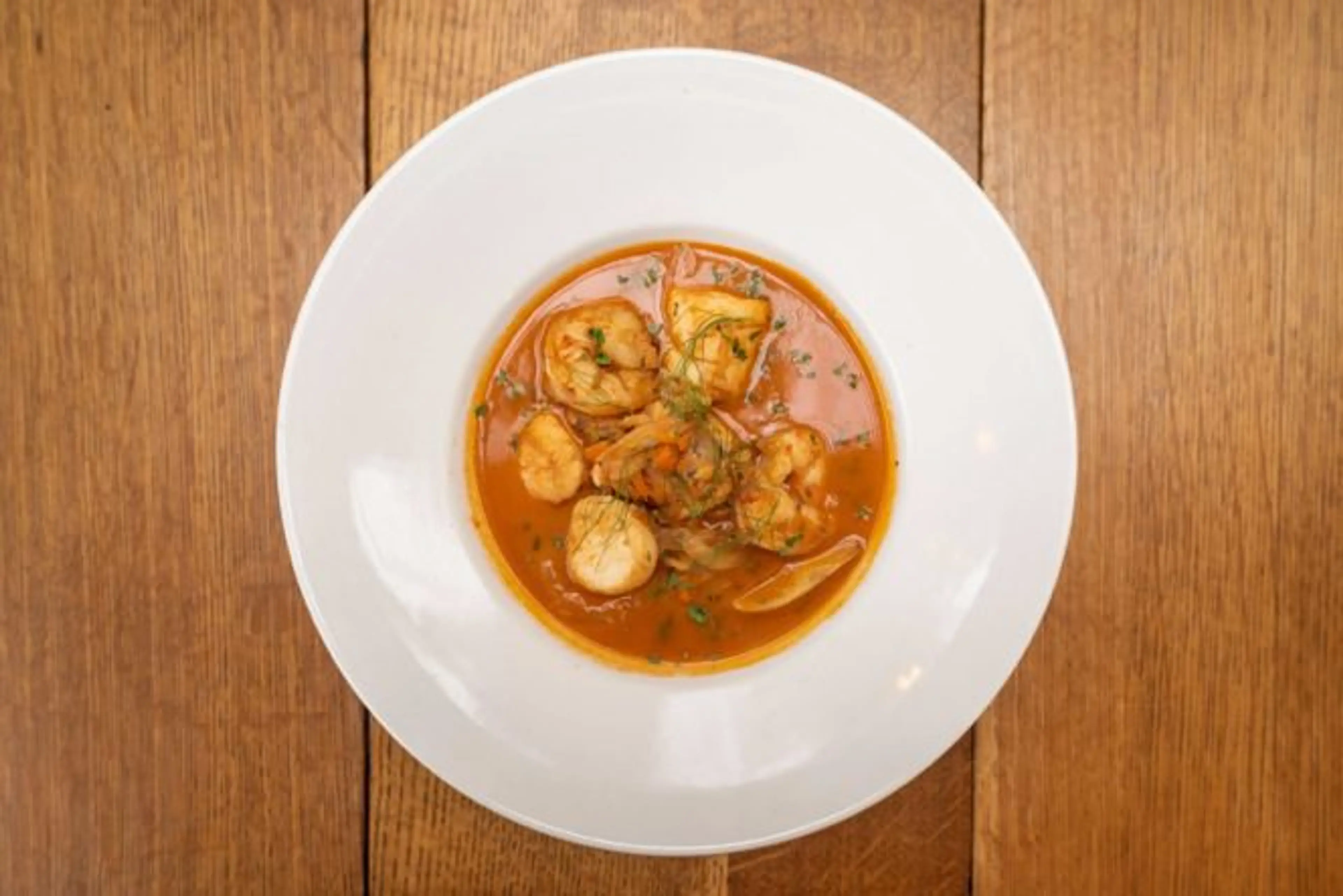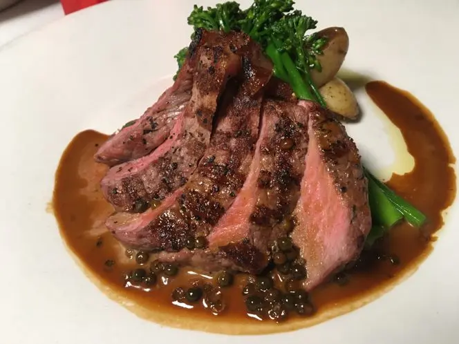 The main course selections are as follows: chicken breast Veronique with grapes, white wine, and brown bigarade sauce; a 6 oz New York striploin, with freshly cracked peppercorns, cognac, and cream; and a fisherman’s soup of scallops, fish, shrimp, fennel, and pernod broth. The striploin was perfectly executed, with great sear.