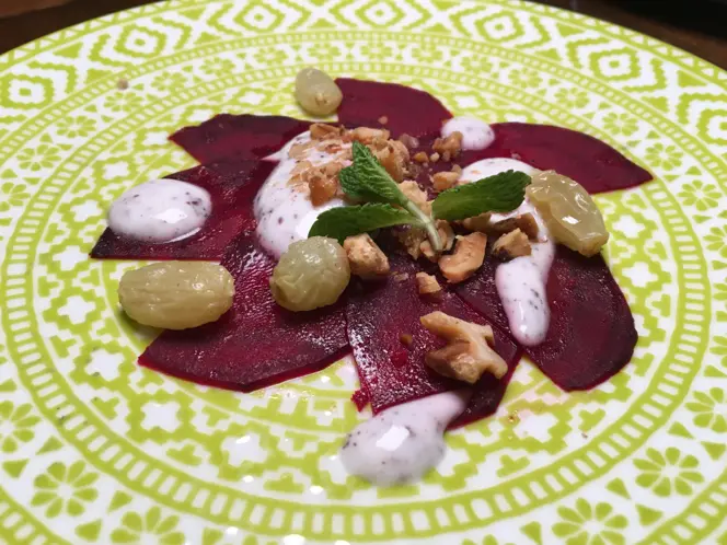 The next course, a raw beet salad with arak raisins, roastedwalnuts, and a sumac yogurt dressing is lovely, with a great play withtextures.