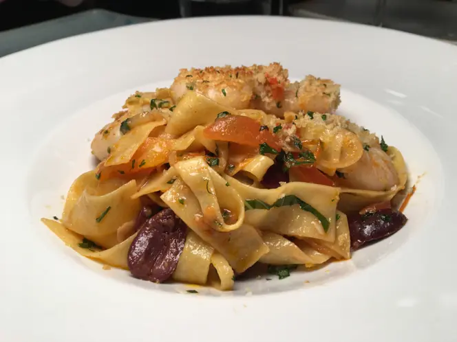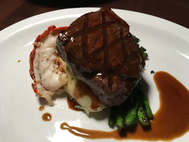The main course offers a selection between herb crusted BCsturgeon, with maple glazed golden beets, carrots, cauliflower and boursincheese purée; a AAA California cut beef striploin with lobster, mashedpotatoes, charred broccolini, and cabernet jus; and jumbo tiger prawnpappardelle with crispy pancetta, black olives, roasted tomatoes, whiteanchovy, and garlic bread crumbs. If you’re craving well-executed surf andturf, definitely go for the steak and lobster, a combo that really can’t bebeat.