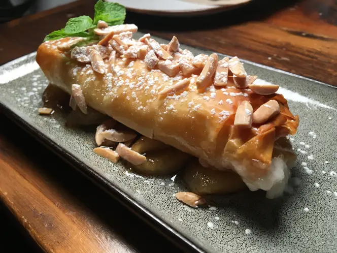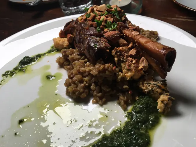 For mains, there’s a choice between braised lamb shank withroasted green freekah, shankleesh, chermoula mint pesto, and almonds; Pacificcod wrapped in grape leaves served with kale samkeh harra and butter beans; andeggplant rolls, black bean broth, and za’atar roasted tomatoes. Out of thethree, I particularly enjoyed the lamb shank, which was wonderfully tender. Theeggplant was also deliciously aromatic.