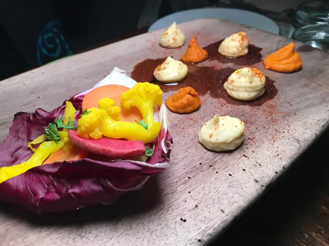 You’ll get to sample them with a first course that consists of hummus mohammara, sweet potato hummus, and assorted pickles (e.g. cauliflower, carrot). The colours of this course are vibrantly appealing.